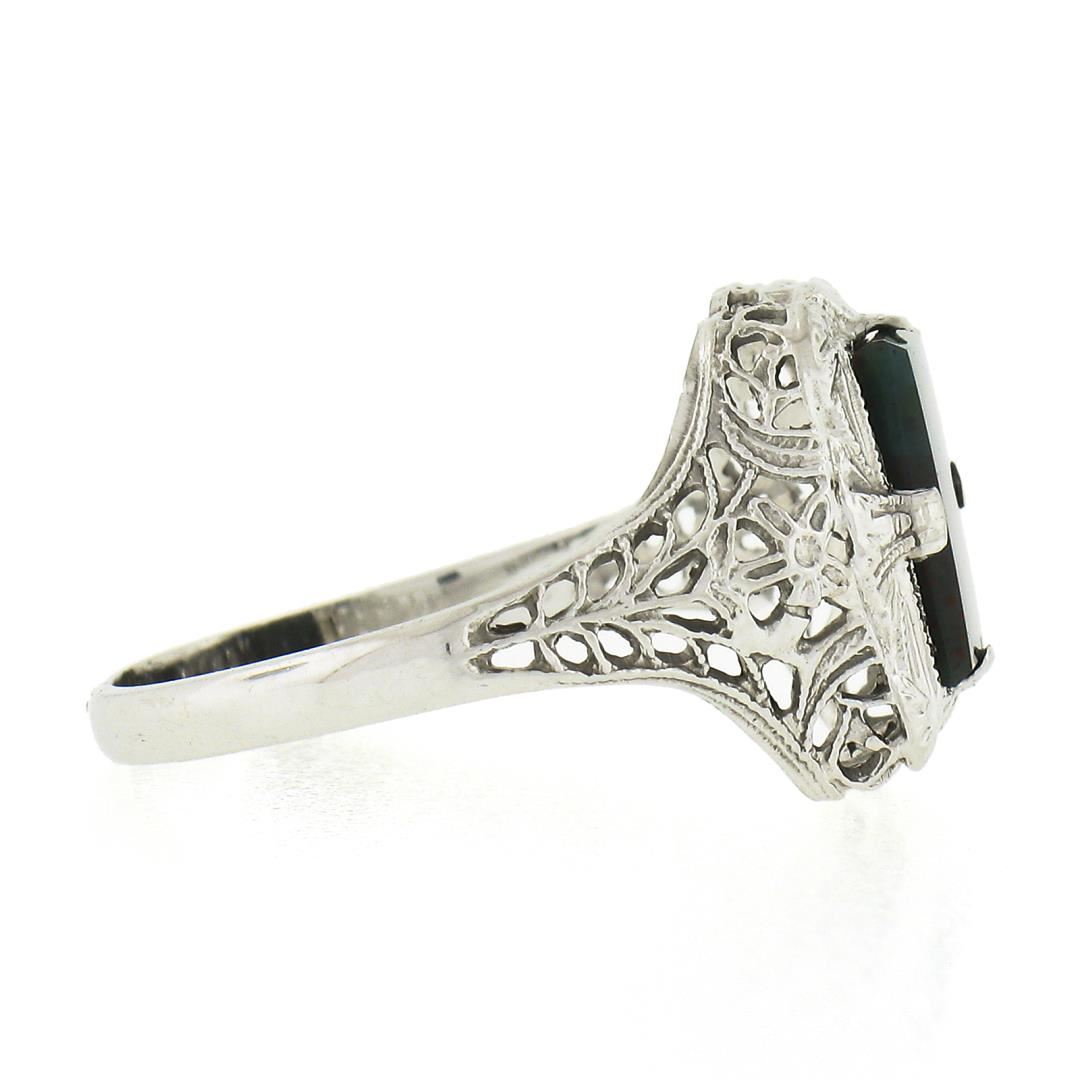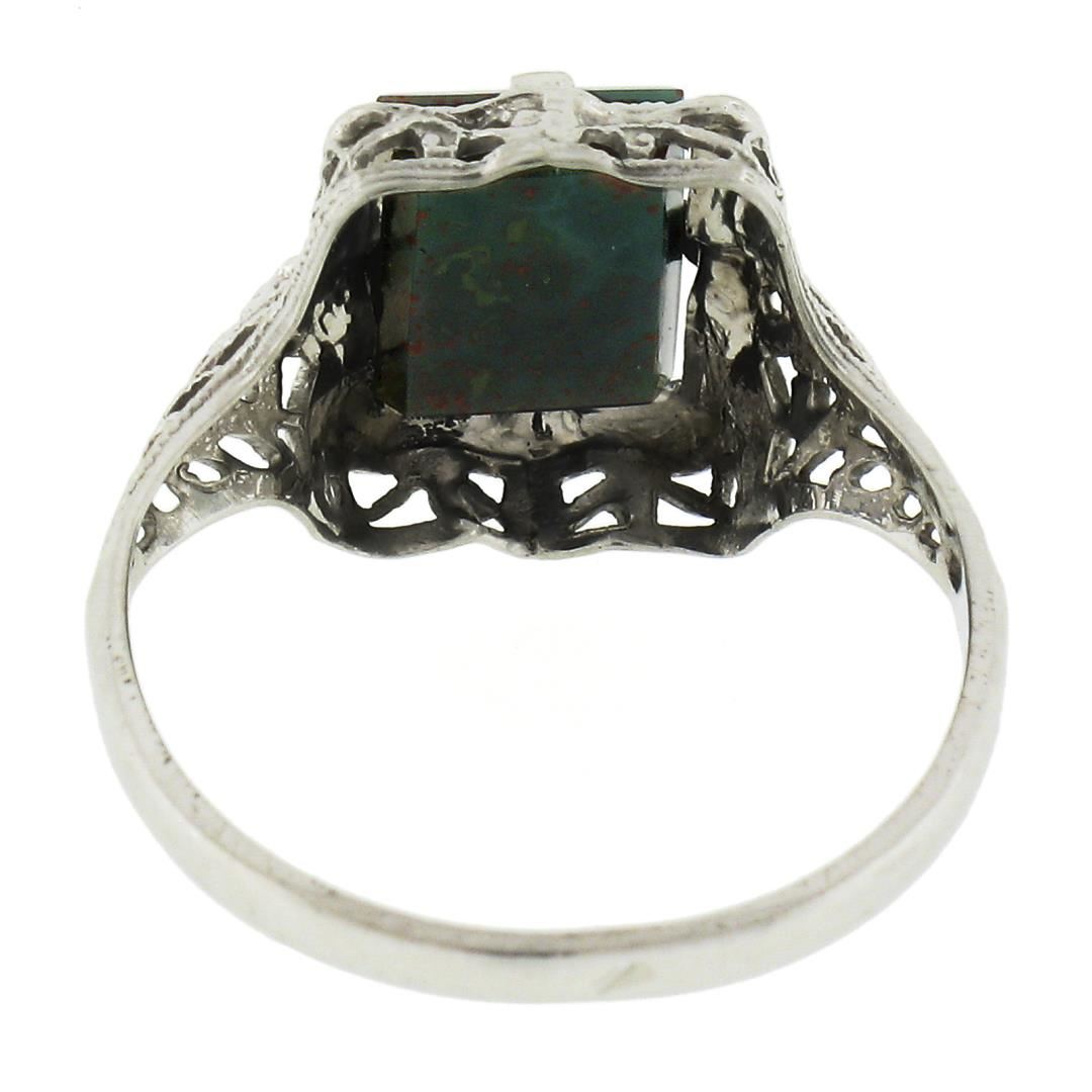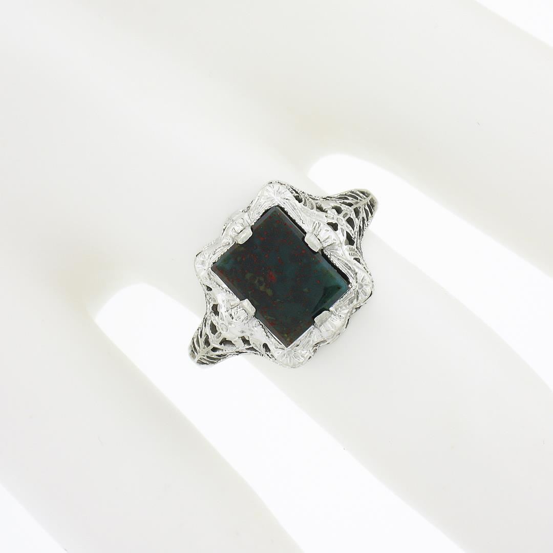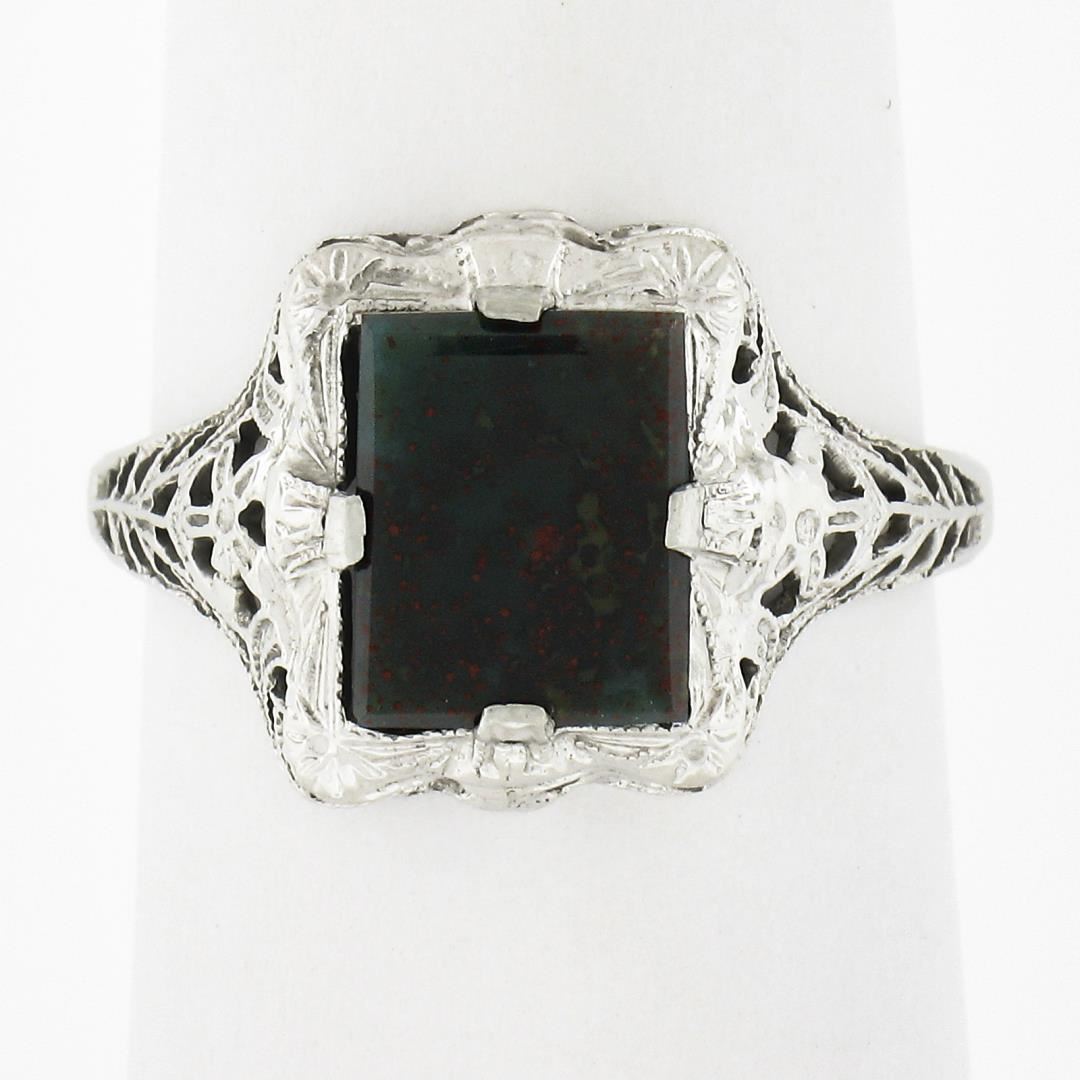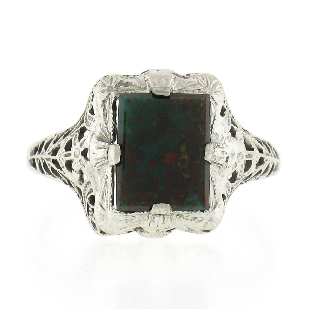An antique solid 14k white gold ring, with 1 rectangular cut natural bloodstone (8.5x6.55mm). The ring is size 6.0, weighs a total of 1.70 grams, and measures 12.1mm wide.