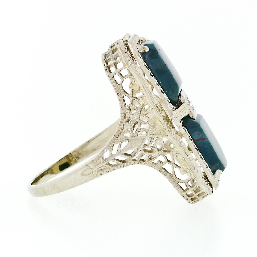 An antique solid 14k white gold filigree ring, with 2 octagonal cut natural bloodstone (8.06x6.86mm), and 1 old european cut natural diamond (J- VS2 ; 0.03ct). The ring is size 6, weighs a total of 3.01 grams, and measures 21.33mm wide.