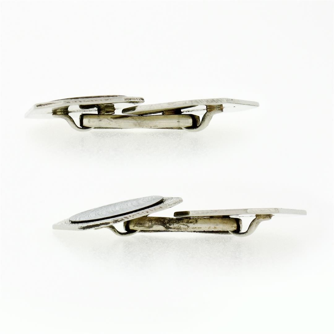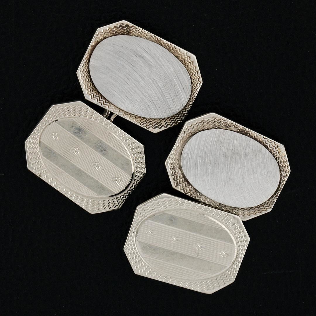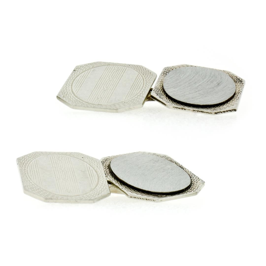 A pair of 14k white gold art deco period cuff links featuring both textured and polished rectangular panels. These cuff links have a dual panel design with a clearance of 14.5mm, weigh a total of 6.89 grams, and the panels measure 16.10x11.75mm.
