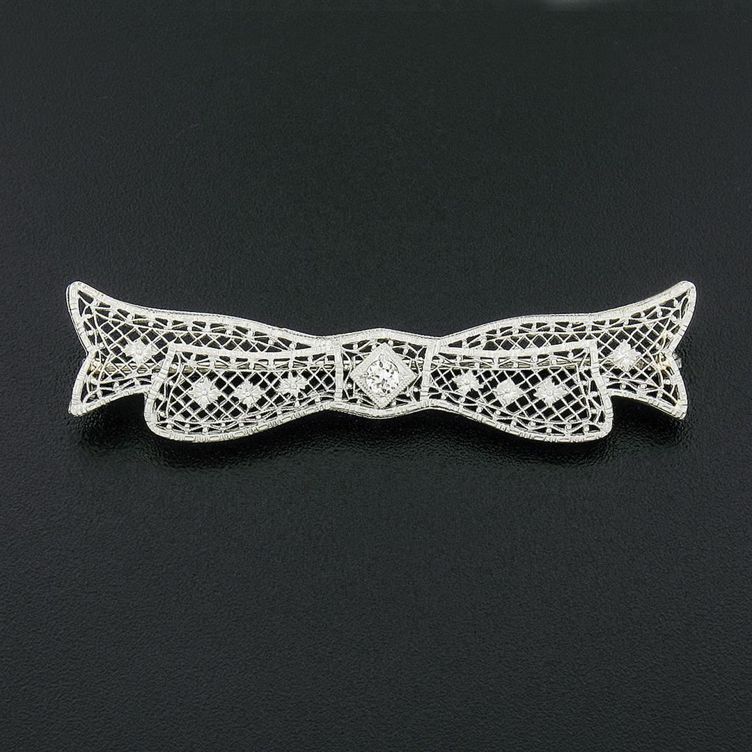 Antique Art Deco 14k White Gold European Diamond Open Filigree Bow Pin Brooch