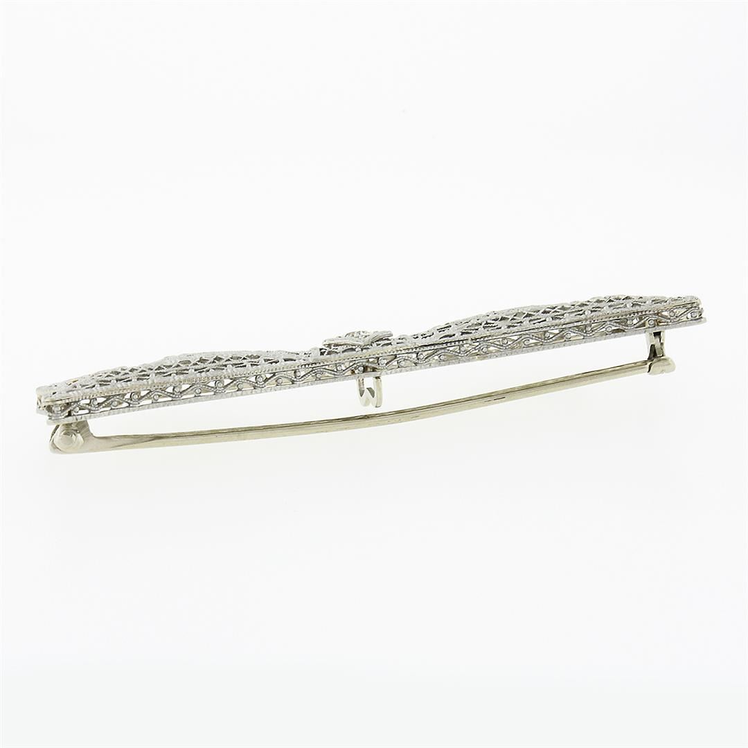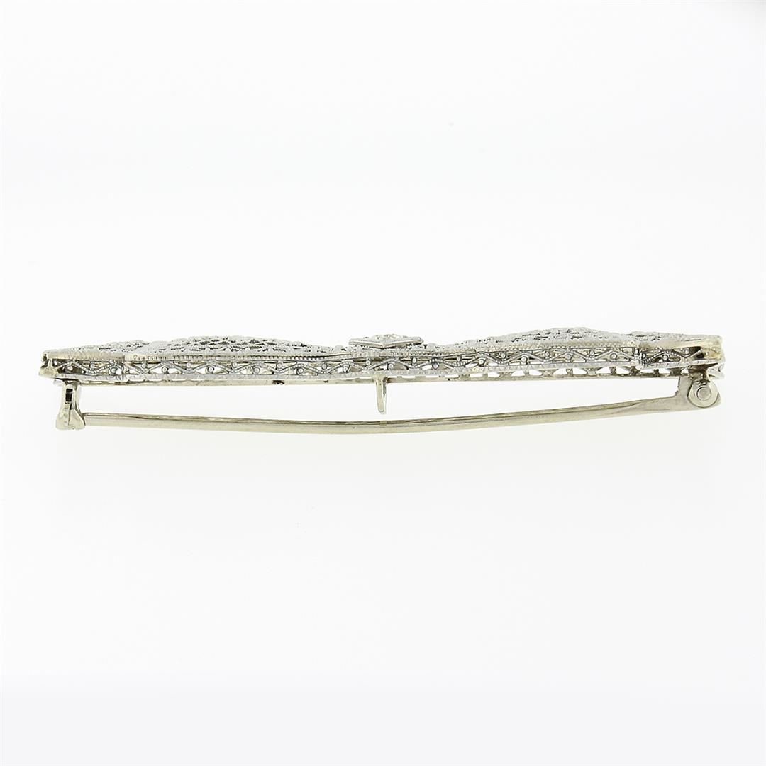 A antique solid 14k white gold bow pin brooch, with 1 old european cut natural diamond (H - VS1 ; 0.15ct ). Measures 14.40x58.45mm and weighs a total of 4.87 grams.