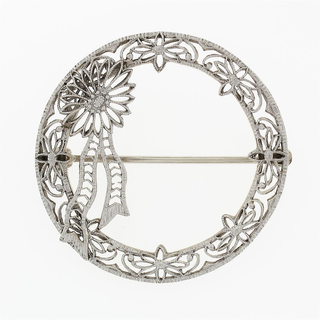 An antique art deco solid 14 white gold wreath brooch. Measures 29mm in diameter and weighs a total of 3.0 grams.
