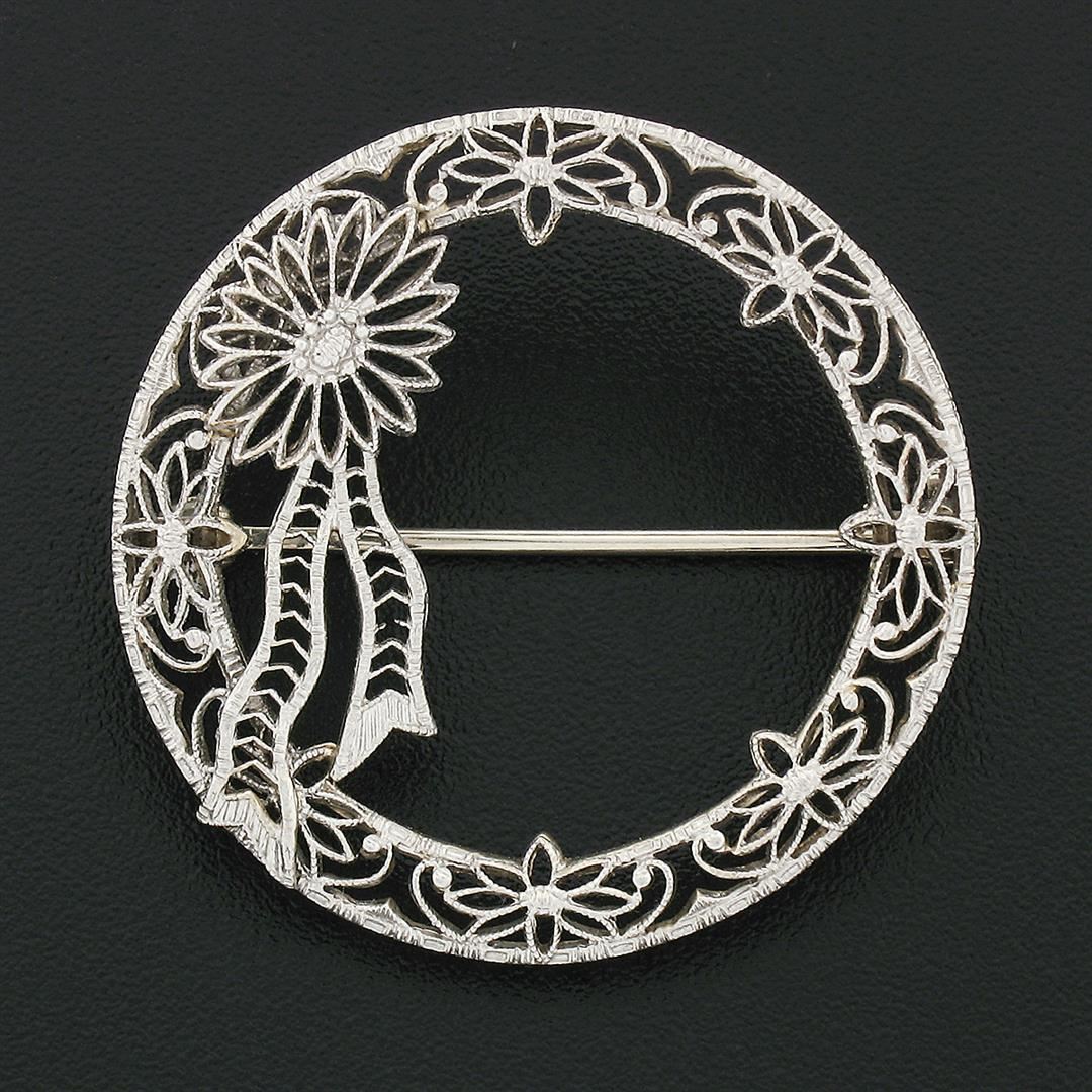 An antique art deco solid 14 white gold wreath brooch. Measures 29mm in diameter and weighs a total of 3.0 grams.