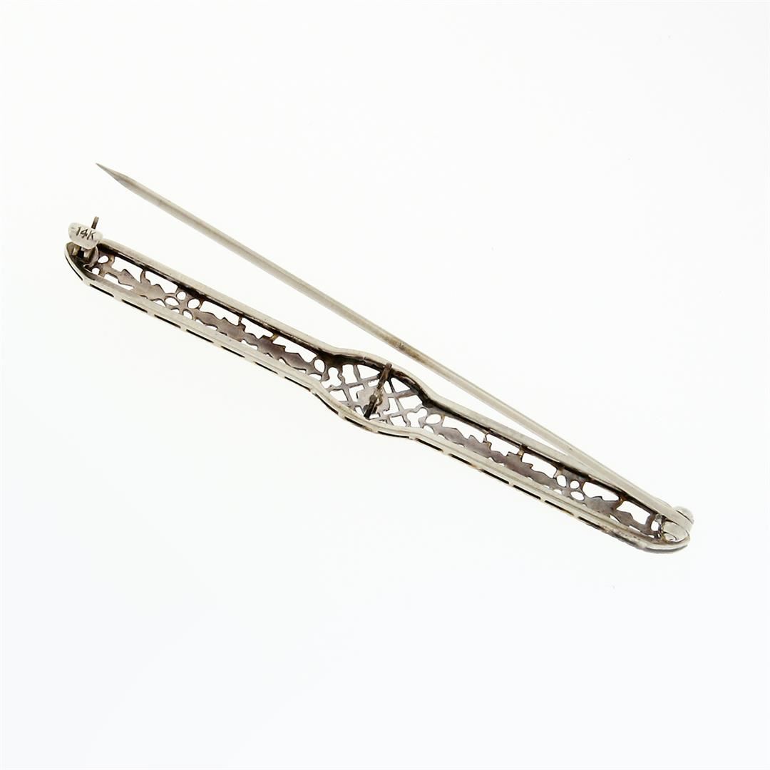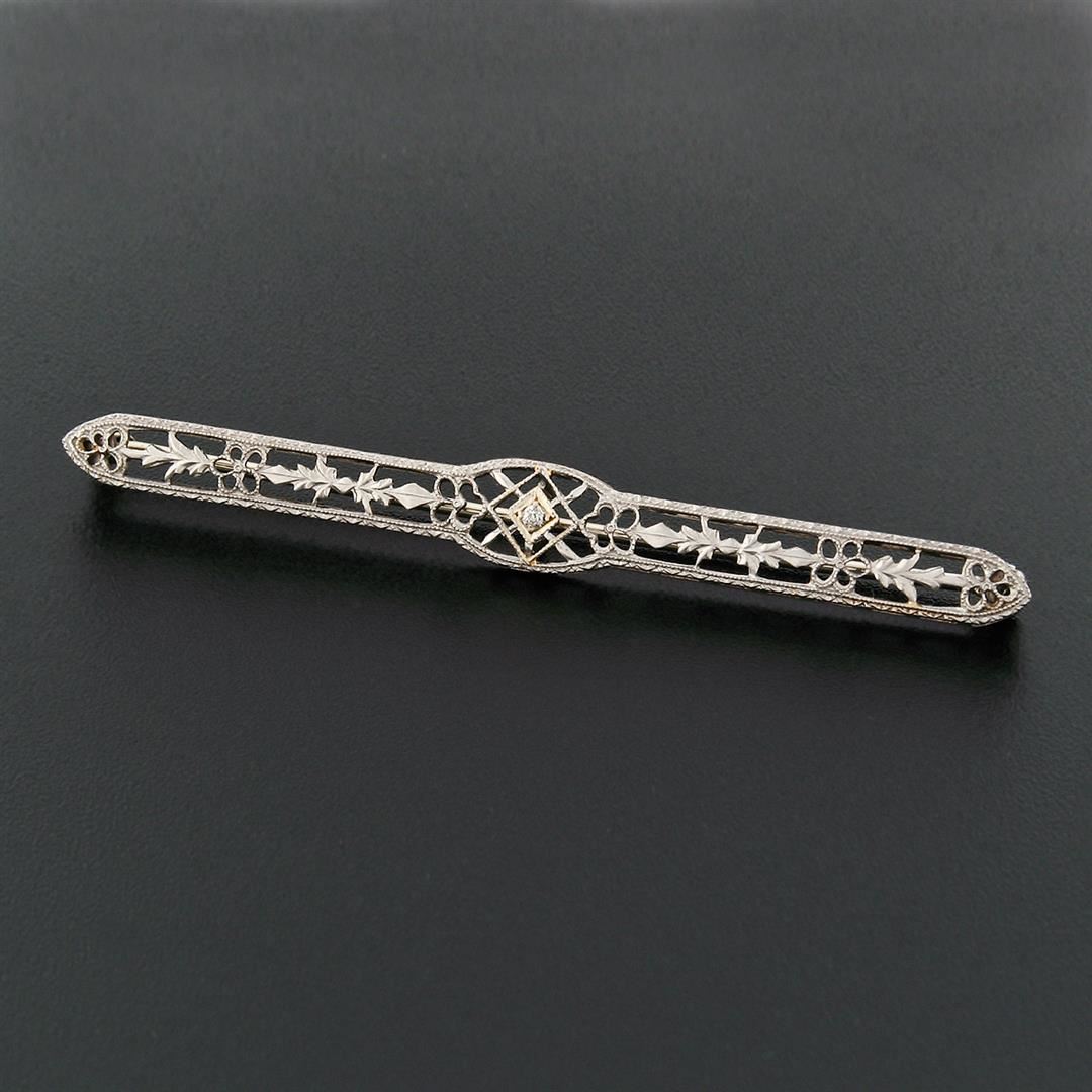 An antique solid 14k whiute gold pin brooch, with 1 old mine cut natural diamond (G- VS2; 0.03ct). Measures 7.02x63.34mm and weighs a total of 3.25 grams.