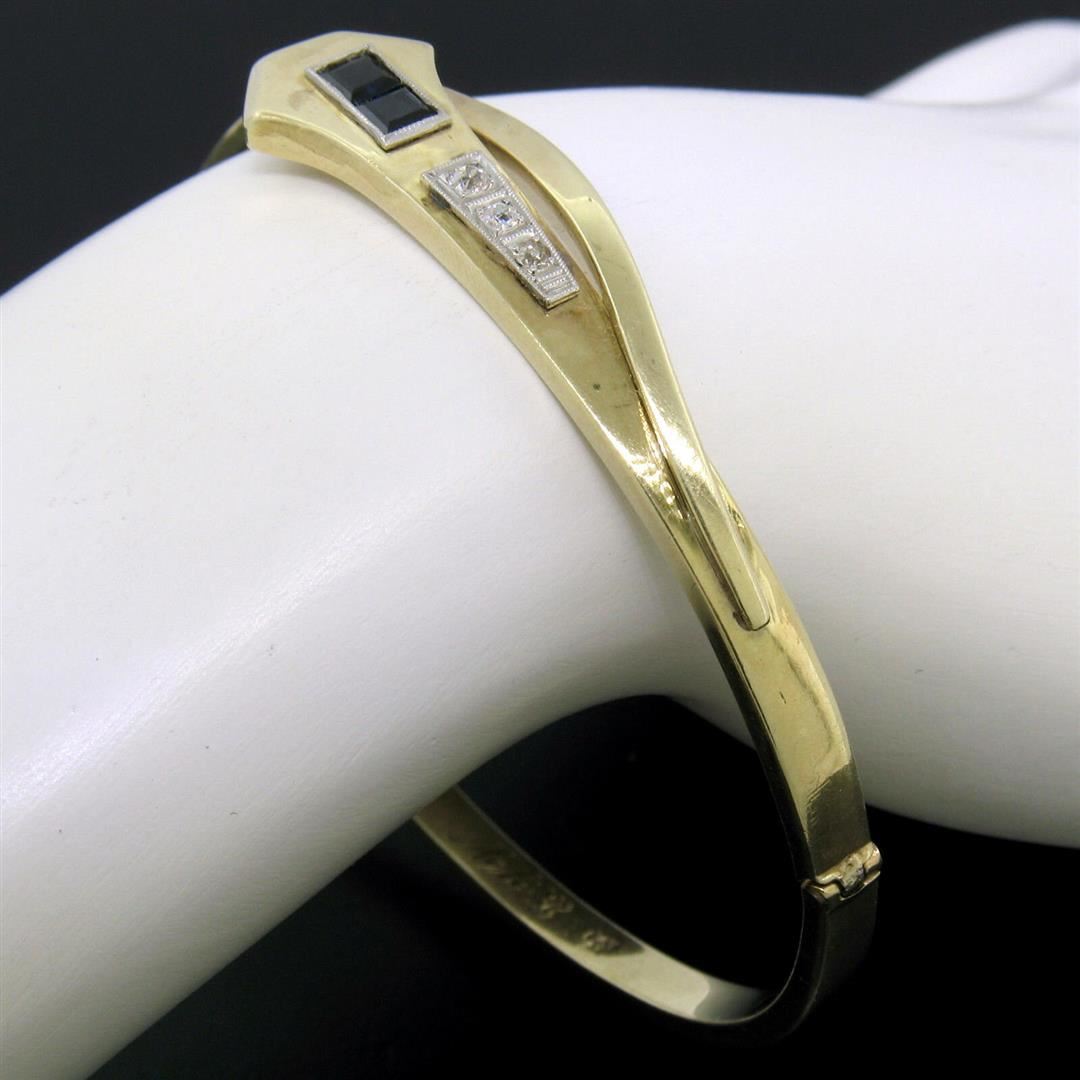 An excellent condition antique 14kt yellow gold bangle bracelet with 0.62ctw of square step cut sapphires and 0.12ctw of old mine cut diamonds (H/I - VS2) set in white gold. It weighs a total of 28.57 grams, measures 13.35mm wide, and measures 7.5 inches in length.