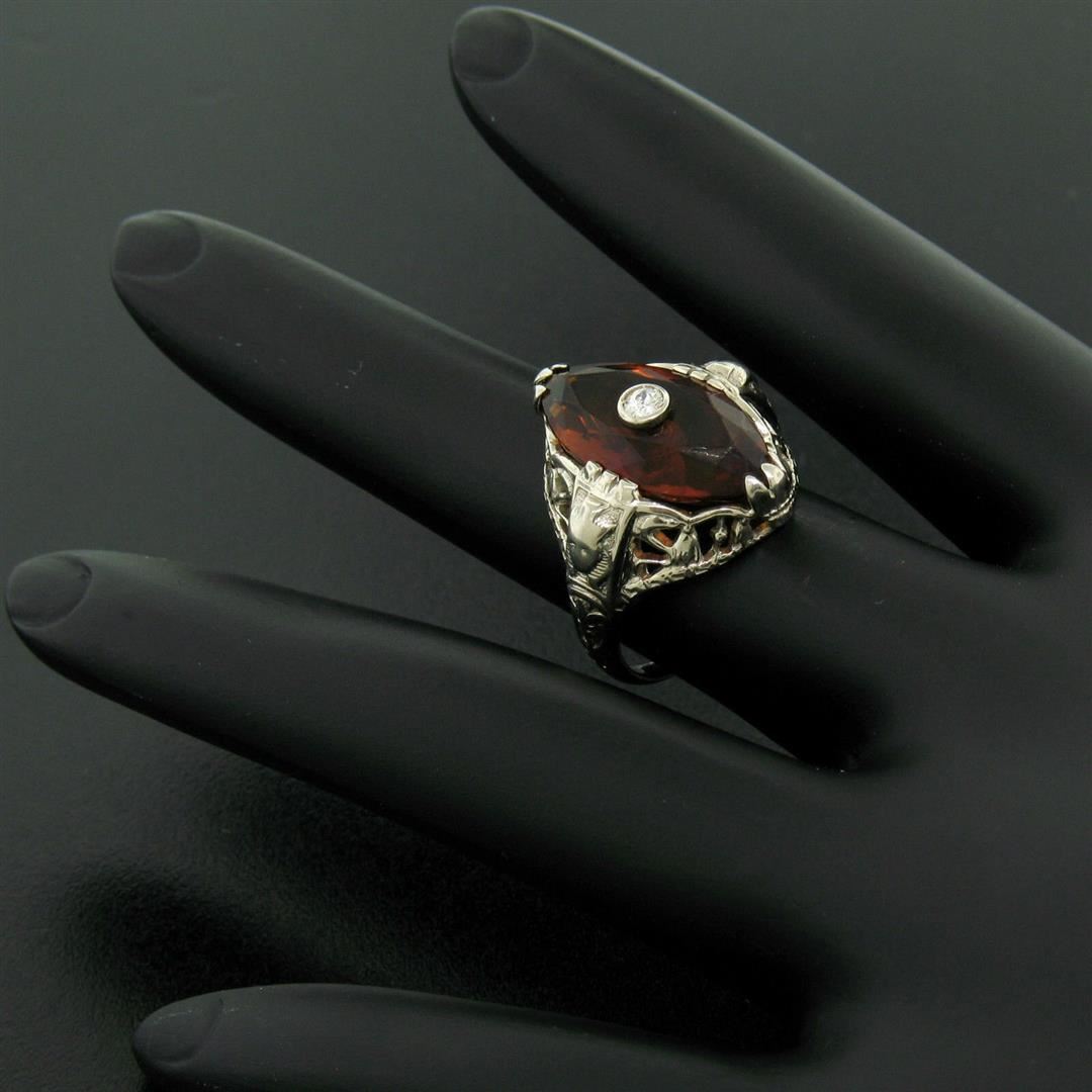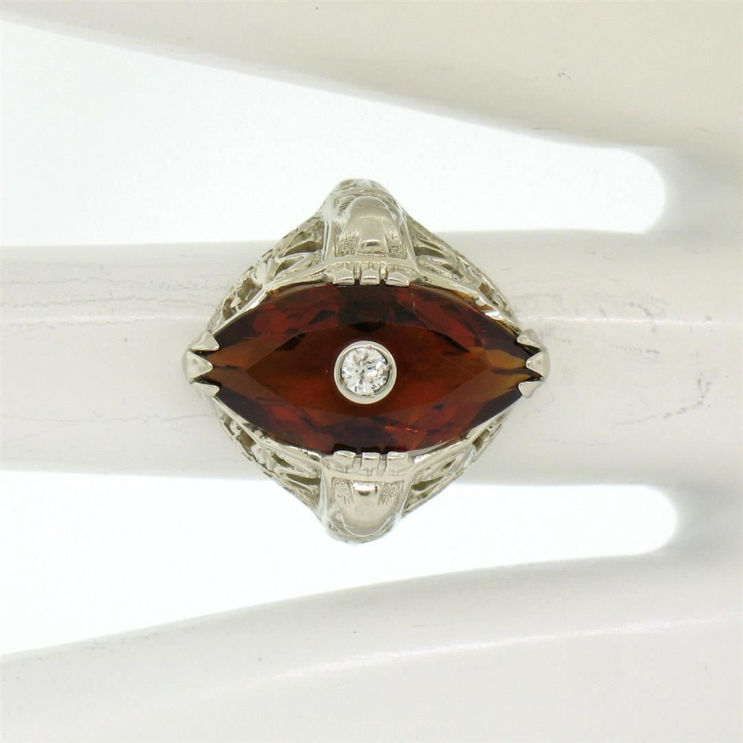 An antique art deco period featuring a 0.11ct European cut diamond (G - VS2) bezel set within a 2.95ct marquise cut citrine. The ring is size 5.5, weighs a total of 4.13 grams, and measures 19.05mm wide.