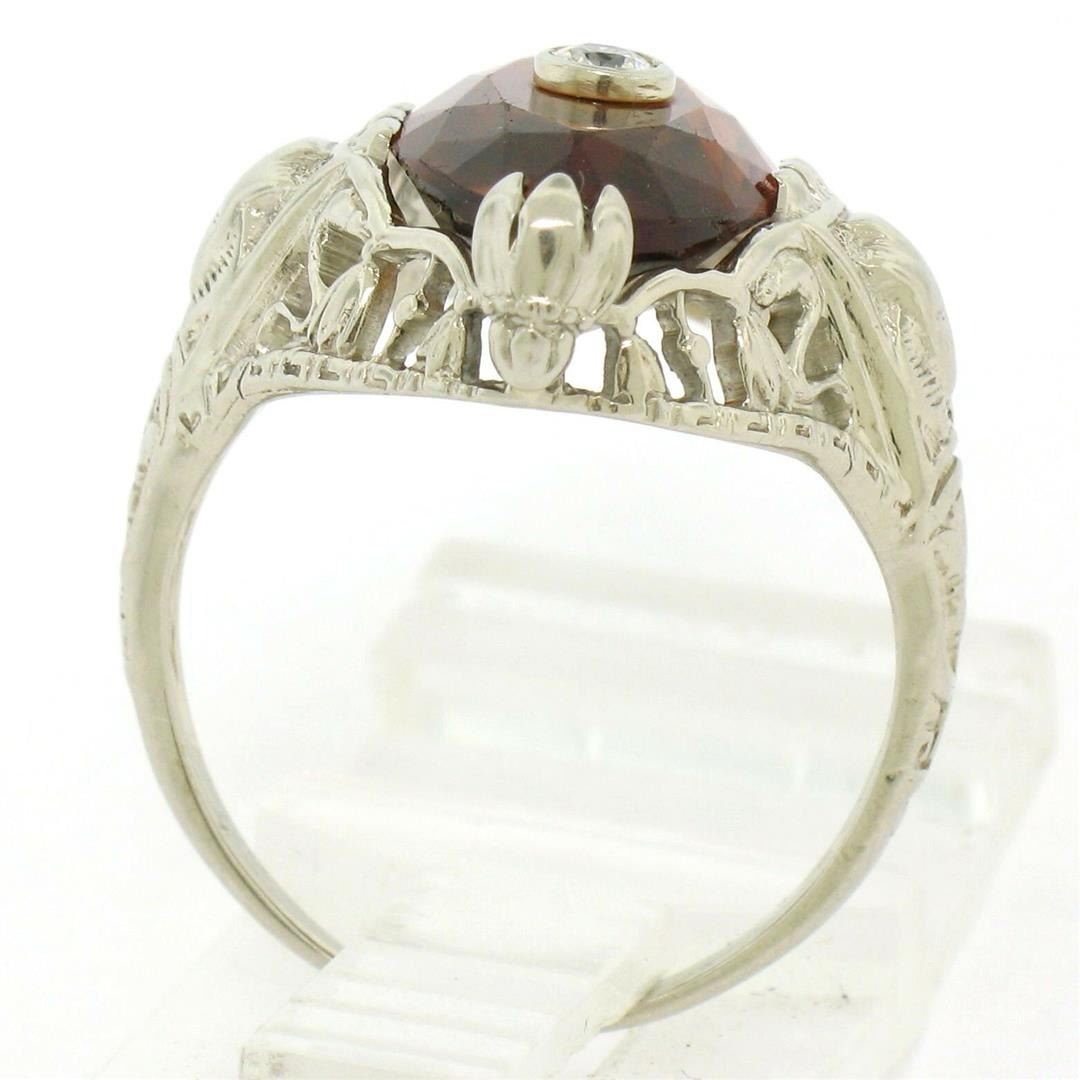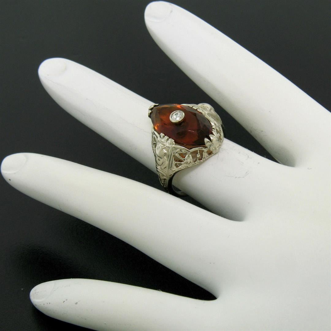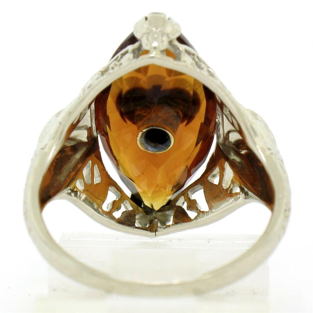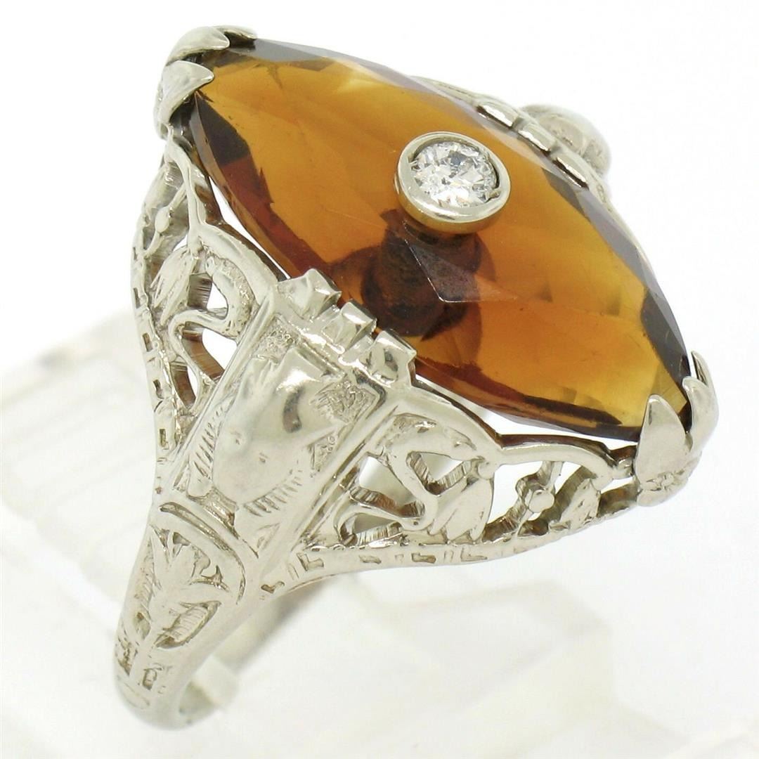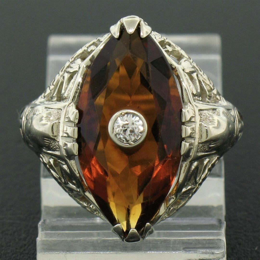 An antique art deco period featuring a 0.11ct European cut diamond (G - VS2) bezel set within a 2.95ct marquise cut citrine. The ring is size 5.5, weighs a total of 4.13 grams, and measures 19.05mm wide.