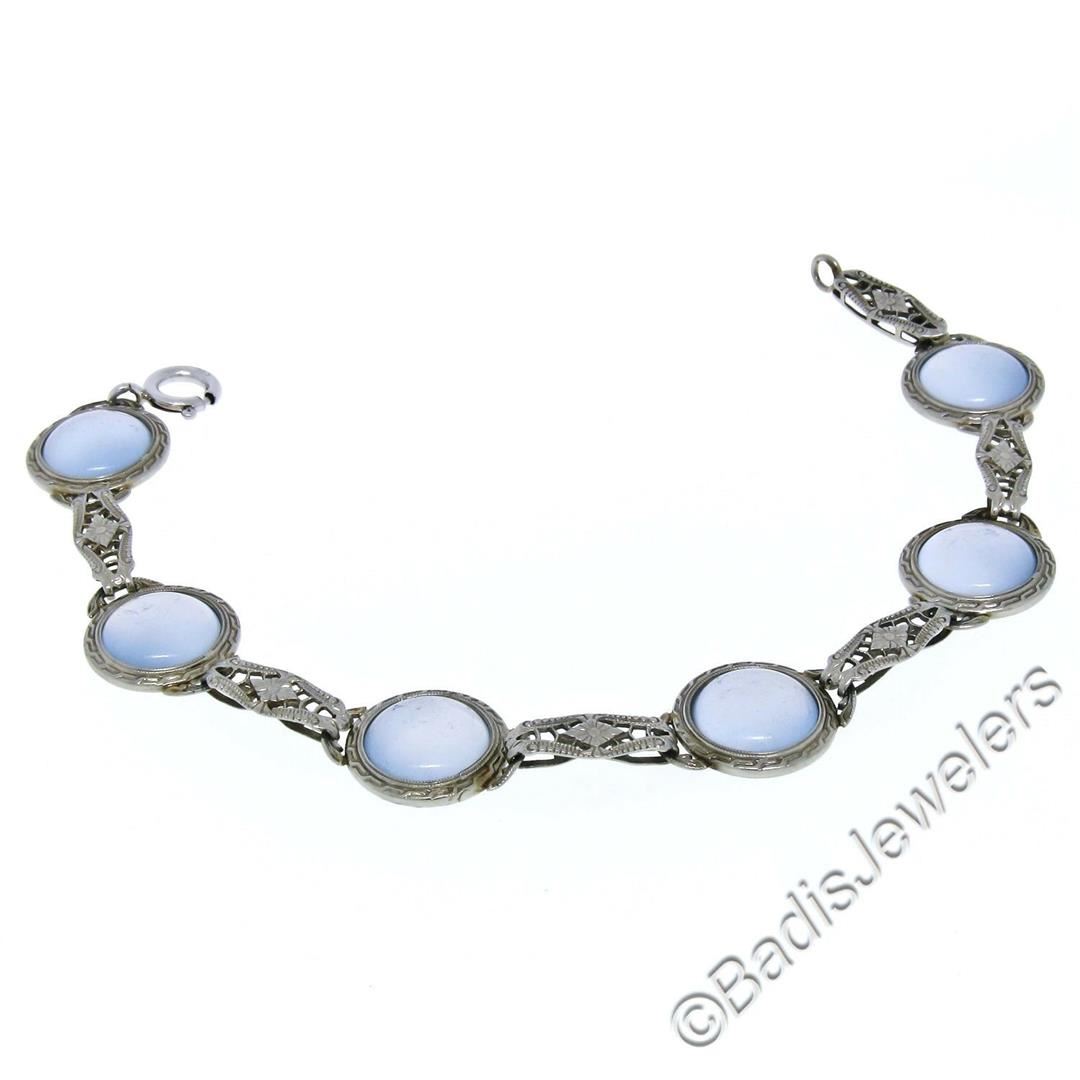 An excellent condition 14kt white gold and platinum topped bracelet with 11mm round cabochon moonstones. It weighs a total of 13.20 grams, measures 14.15mm wide, and measures 7.5 inches in length.