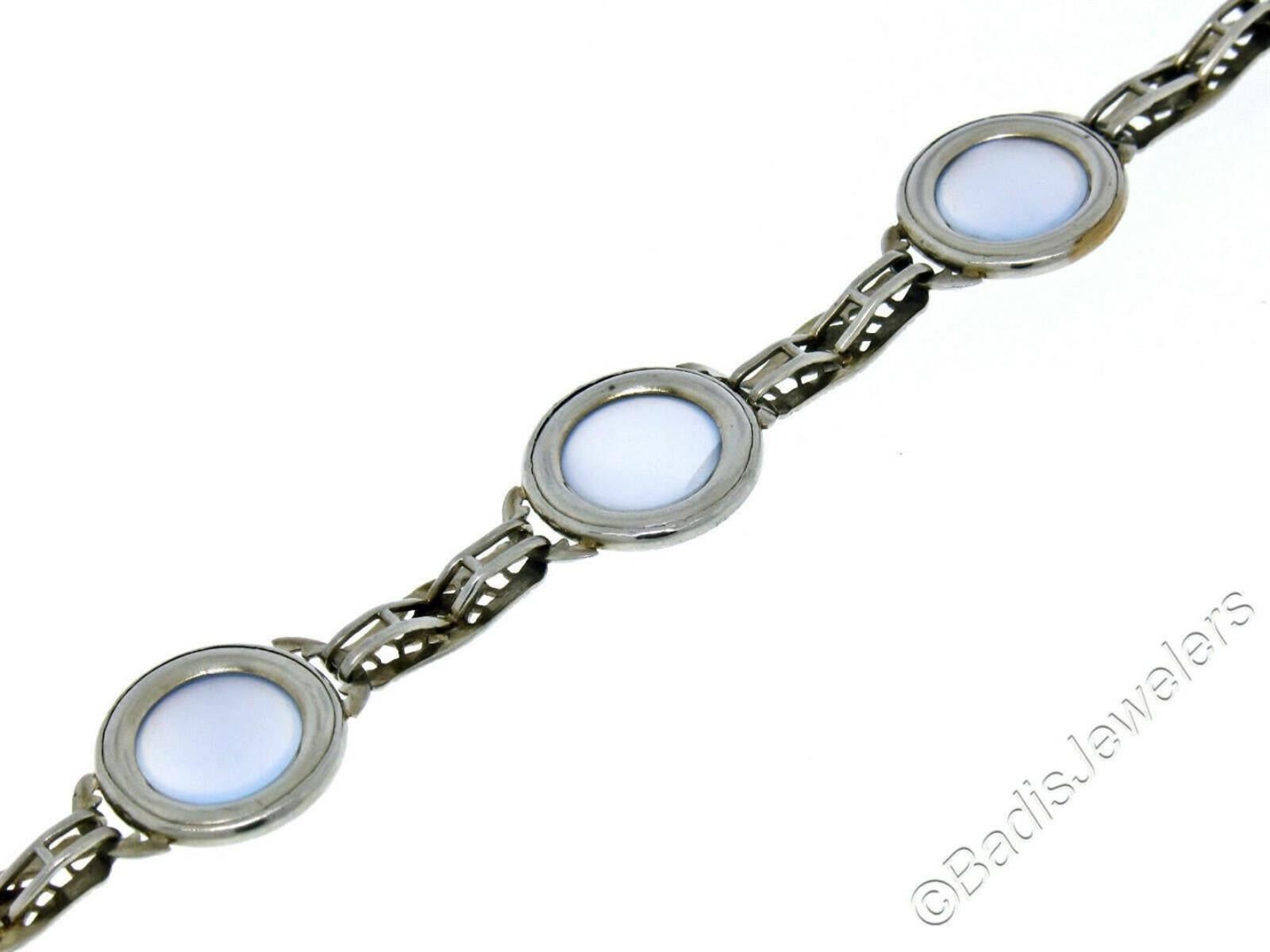 An excellent condition 14kt white gold and platinum topped bracelet with 11mm round cabochon moonstones. It weighs a total of 13.20 grams, measures 14.15mm wide, and measures 7.5 inches in length.