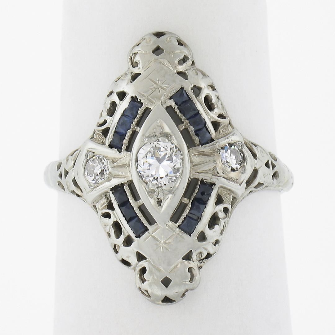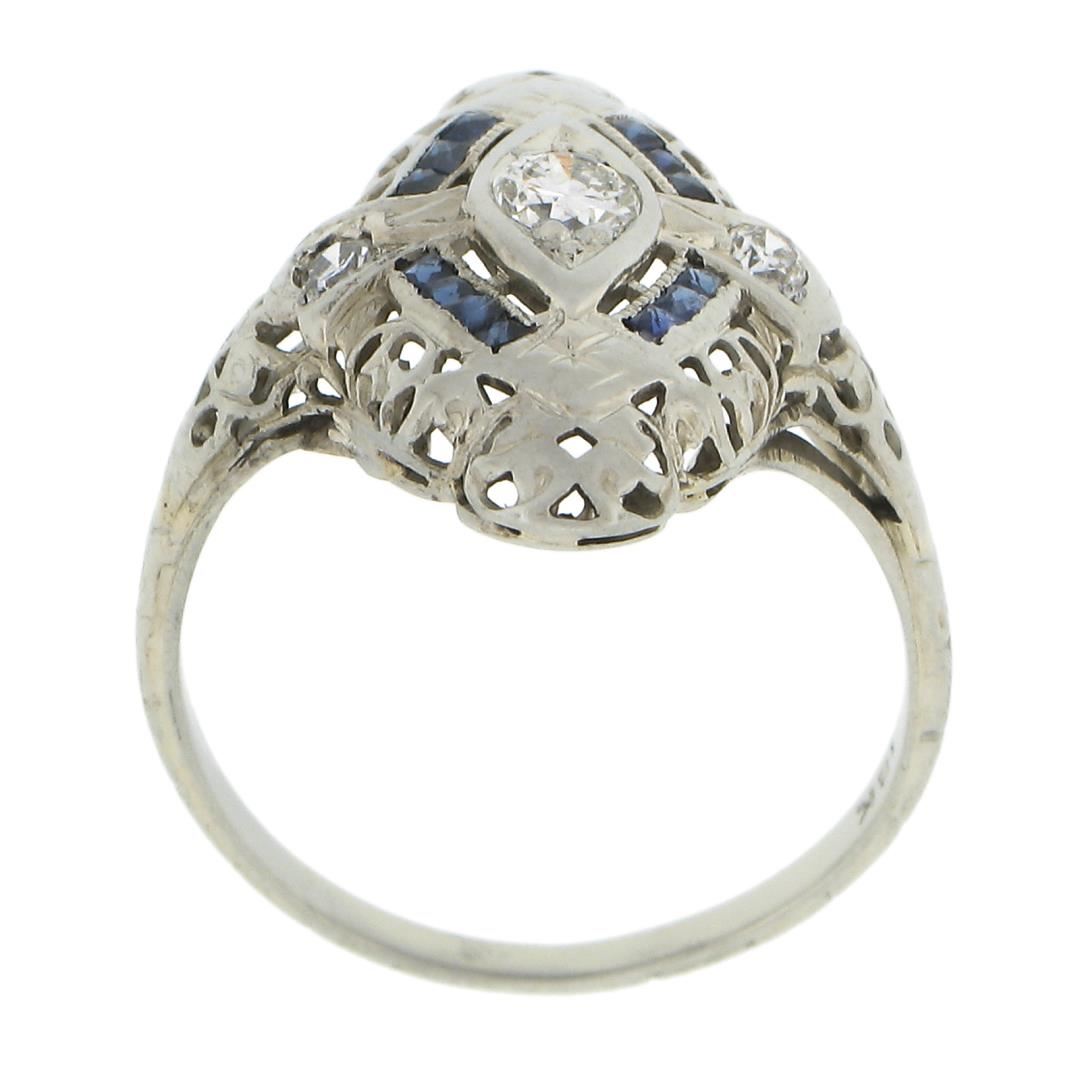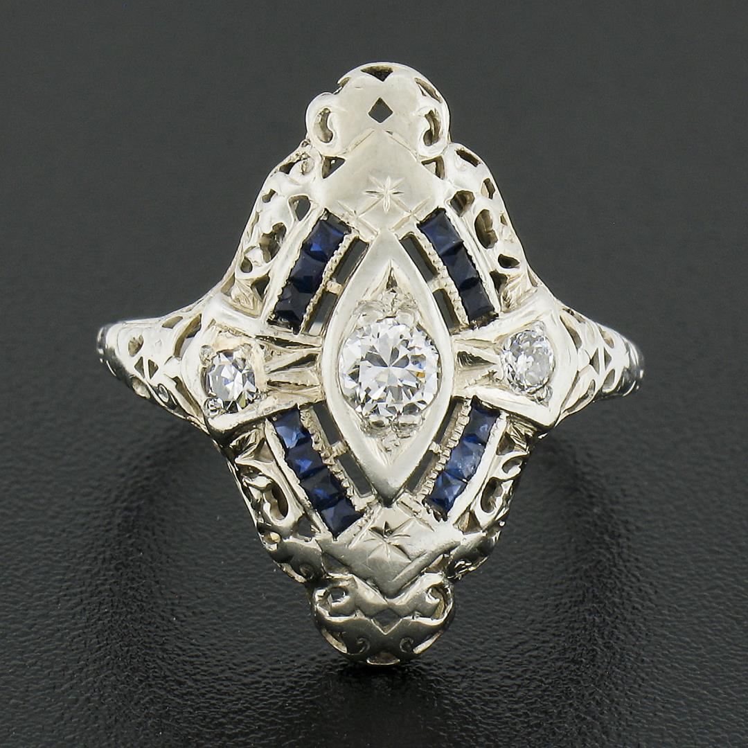 An antique solid 18k white gold navette ring, with 1 old european cut natural diamond (0.12ct), and 12 french calibre cut synthetic sapphires. The ring is size 6.0, weighs a total of 2.47 grams, and measures 19.6mm wide.