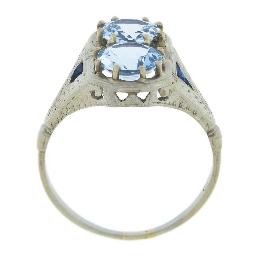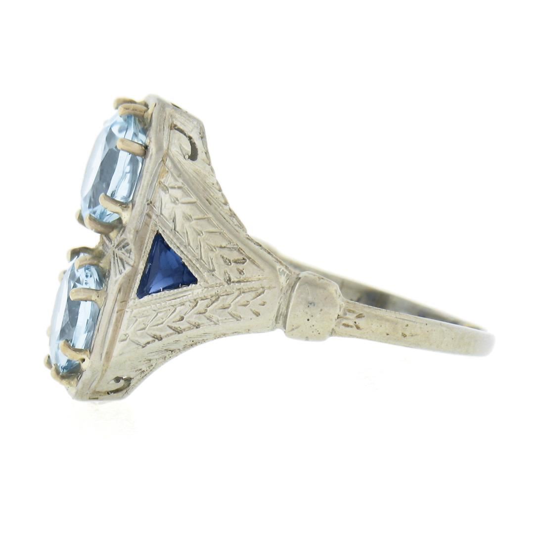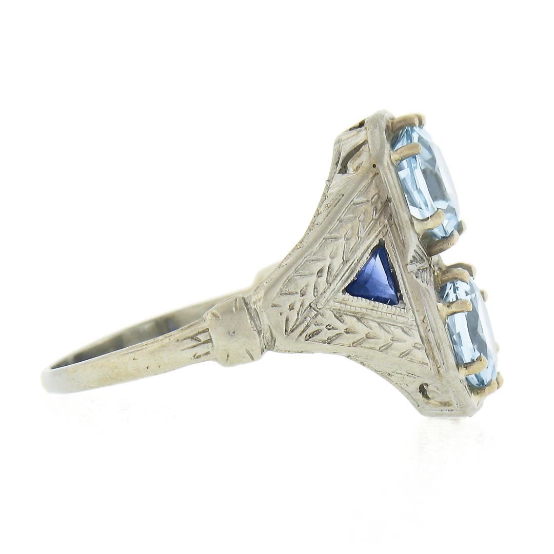 An antique solid 18k white gold ring, with 2 round cut natural aquamarines (6.5mm - 1.62ctw), and 2 French trillion cut synthetic sapphires (3.3mm ). The ring is size 7.0, weighs a total of 4.35 grams, and measures 16.3mm wide.