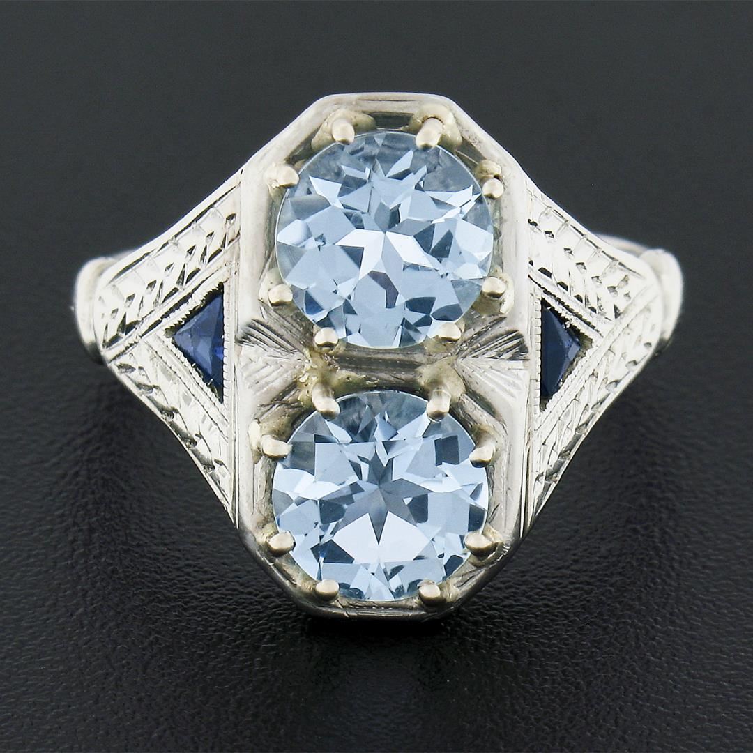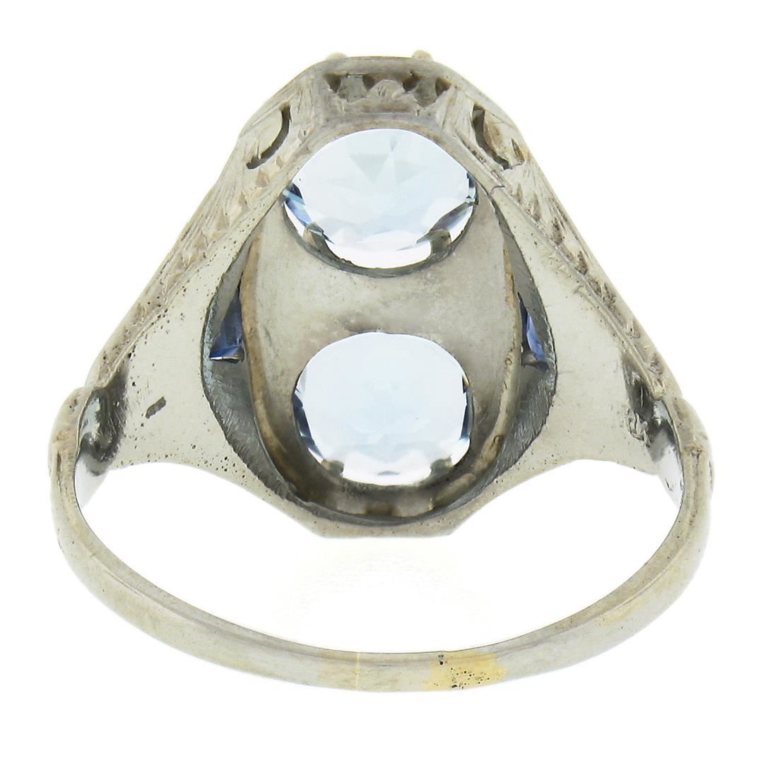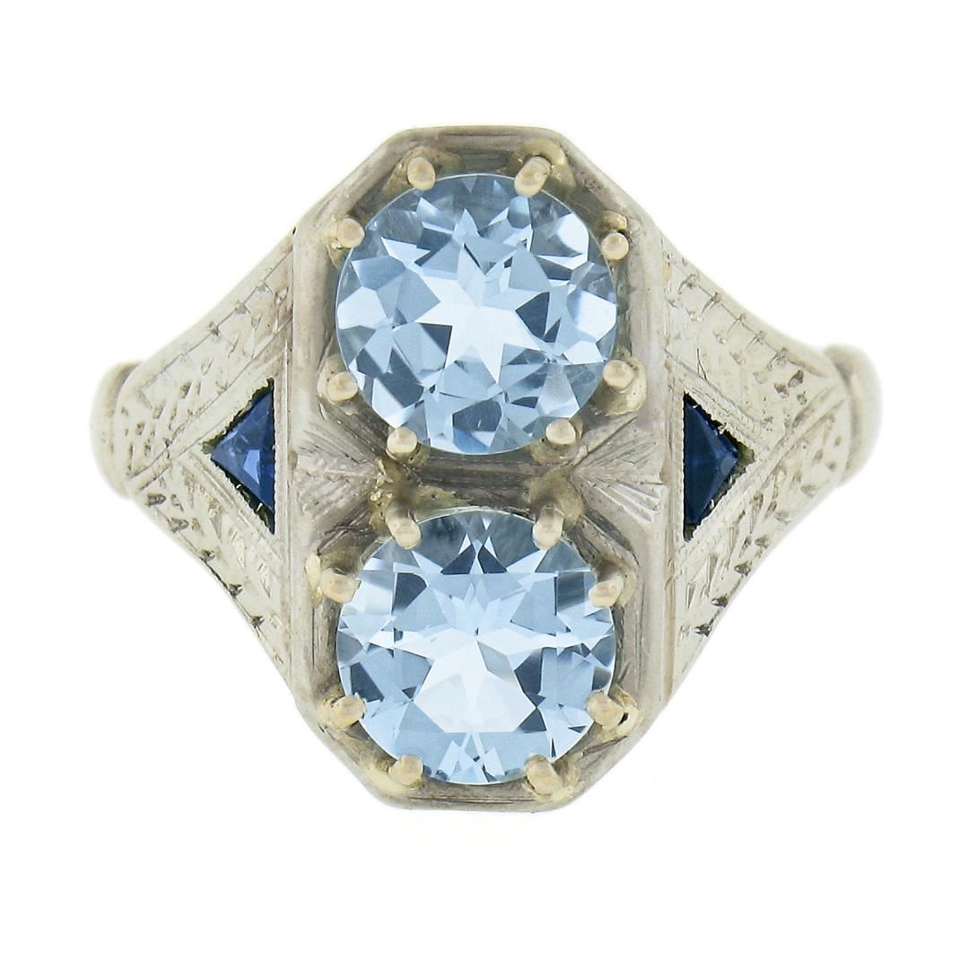 An antique solid 18k white gold ring, with 2 round cut natural aquamarines (6.5mm - 1.62ctw), and 2 French trillion cut synthetic sapphires (3.3mm ). The ring is size 7.0, weighs a total of 4.35 grams, and measures 16.3mm wide.