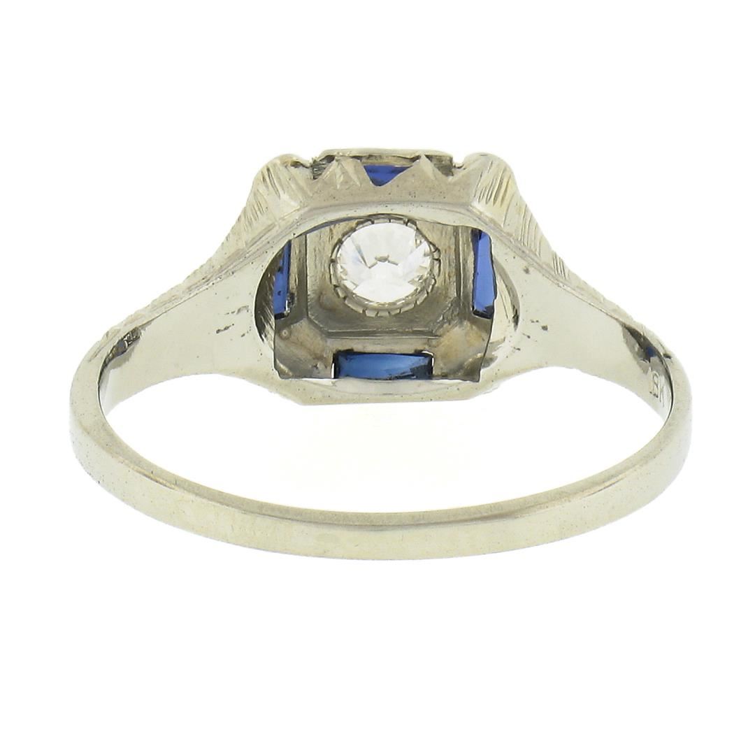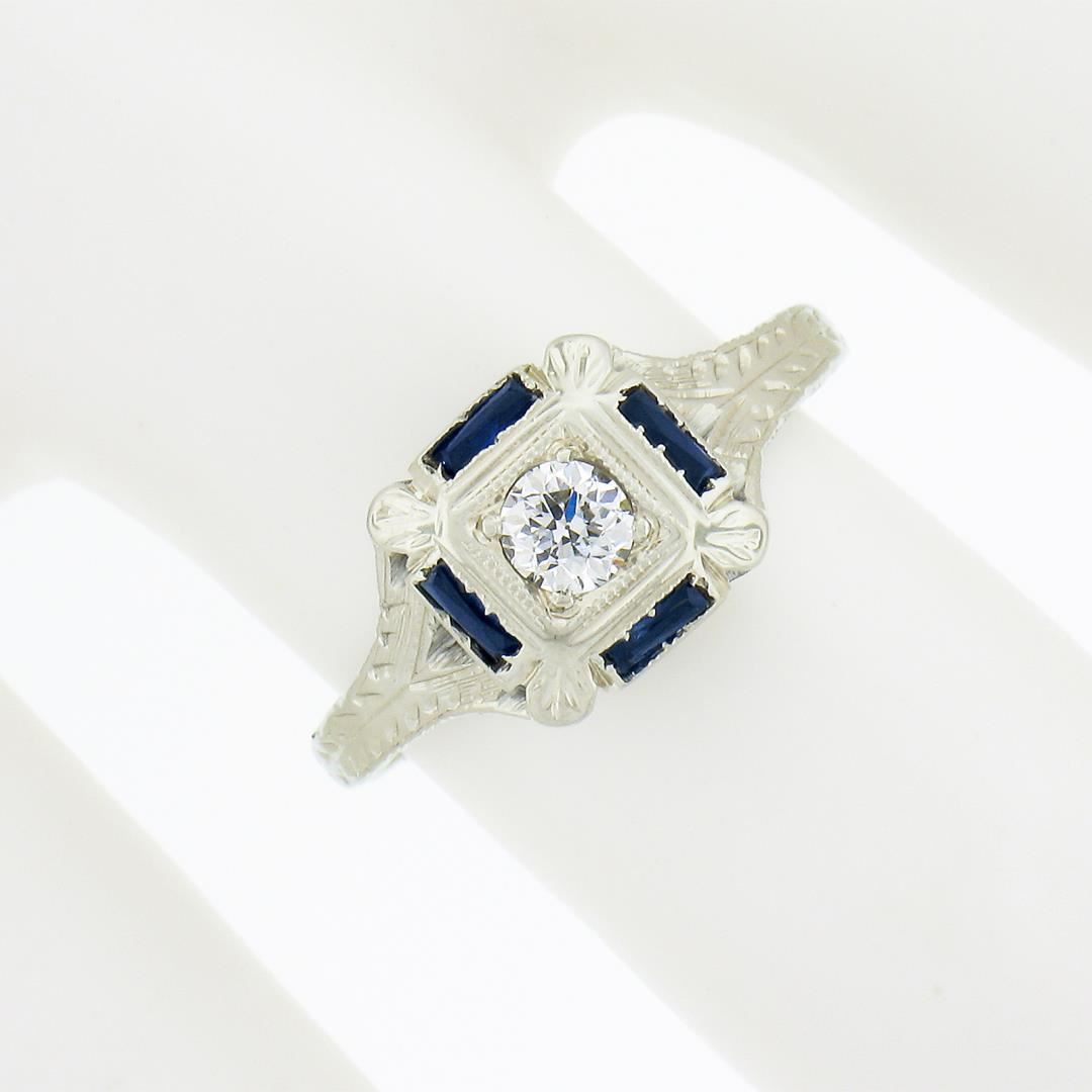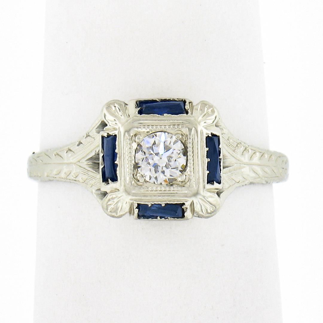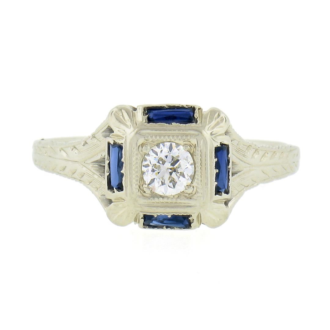 An antique solid 18k white gold ring, with 1 old European cut natural diamond (G - VS1 ;- 0.15ct), and 4 French baguette cut synthetic sapphires (3.3x1.2mm each ). The ring is size 5.0, weighs a total of 2.02 grams, and measures 8mm wide.