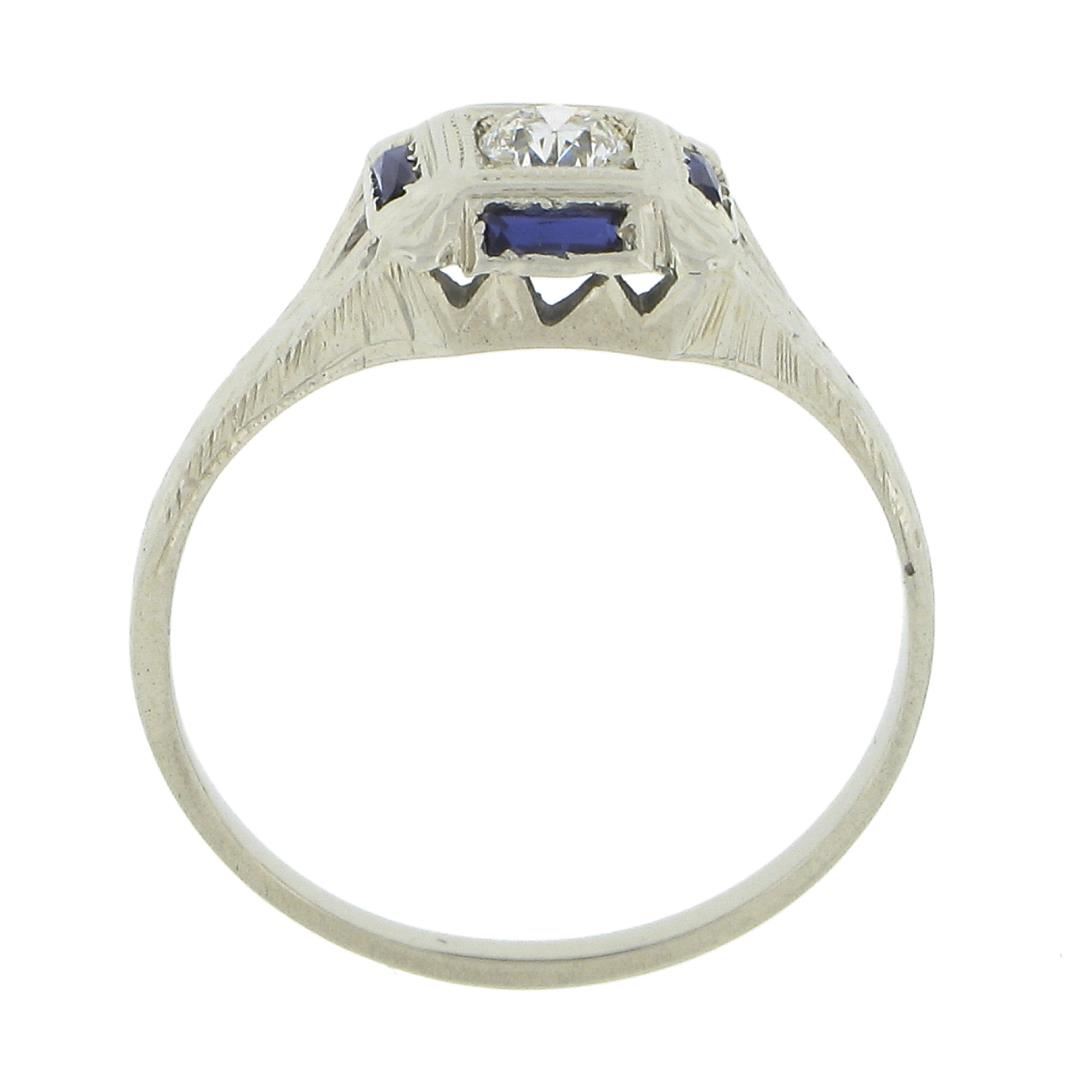 An antique solid 18k white gold ring, with 1 old European cut natural diamond (G - VS1 ;- 0.15ct), and 4 French baguette cut synthetic sapphires (3.3x1.2mm each ). The ring is size 5.0, weighs a total of 2.02 grams, and measures 8mm wide.