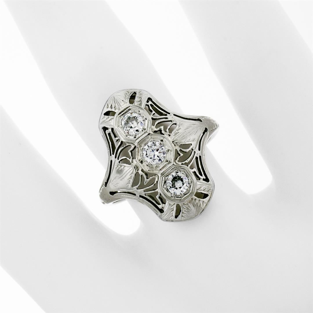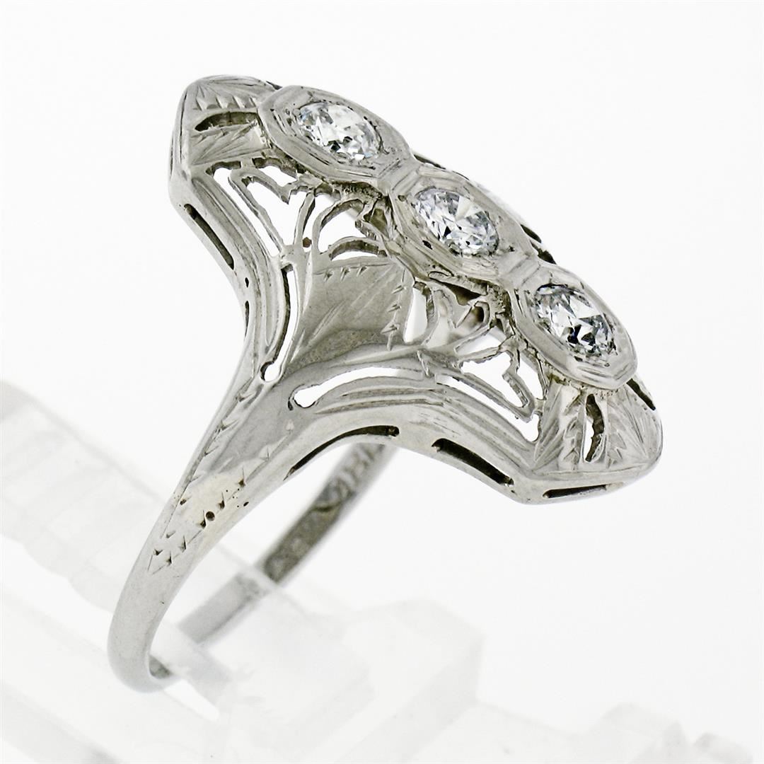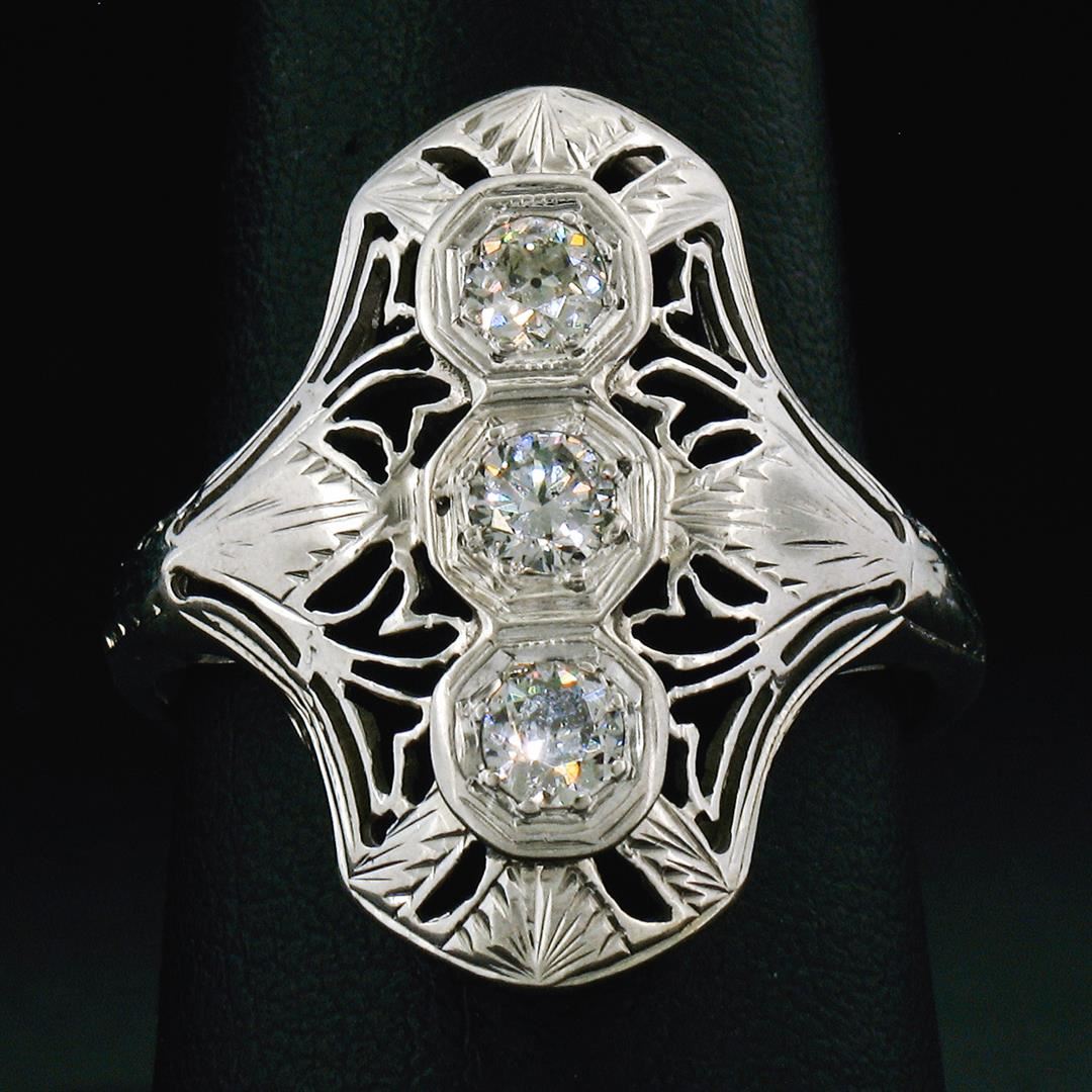 An antique solid 18k white gold filigree dinner ring, with 3 old european cut natural diamonds (G/H- VS2/SI1; 0.35ctw). The ring is size 6.0, weighs a total of 3.28 grams, and measures 20.50mm wide.