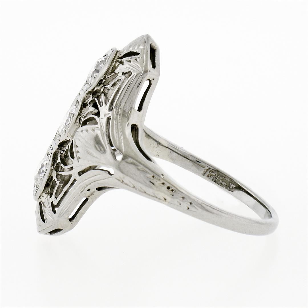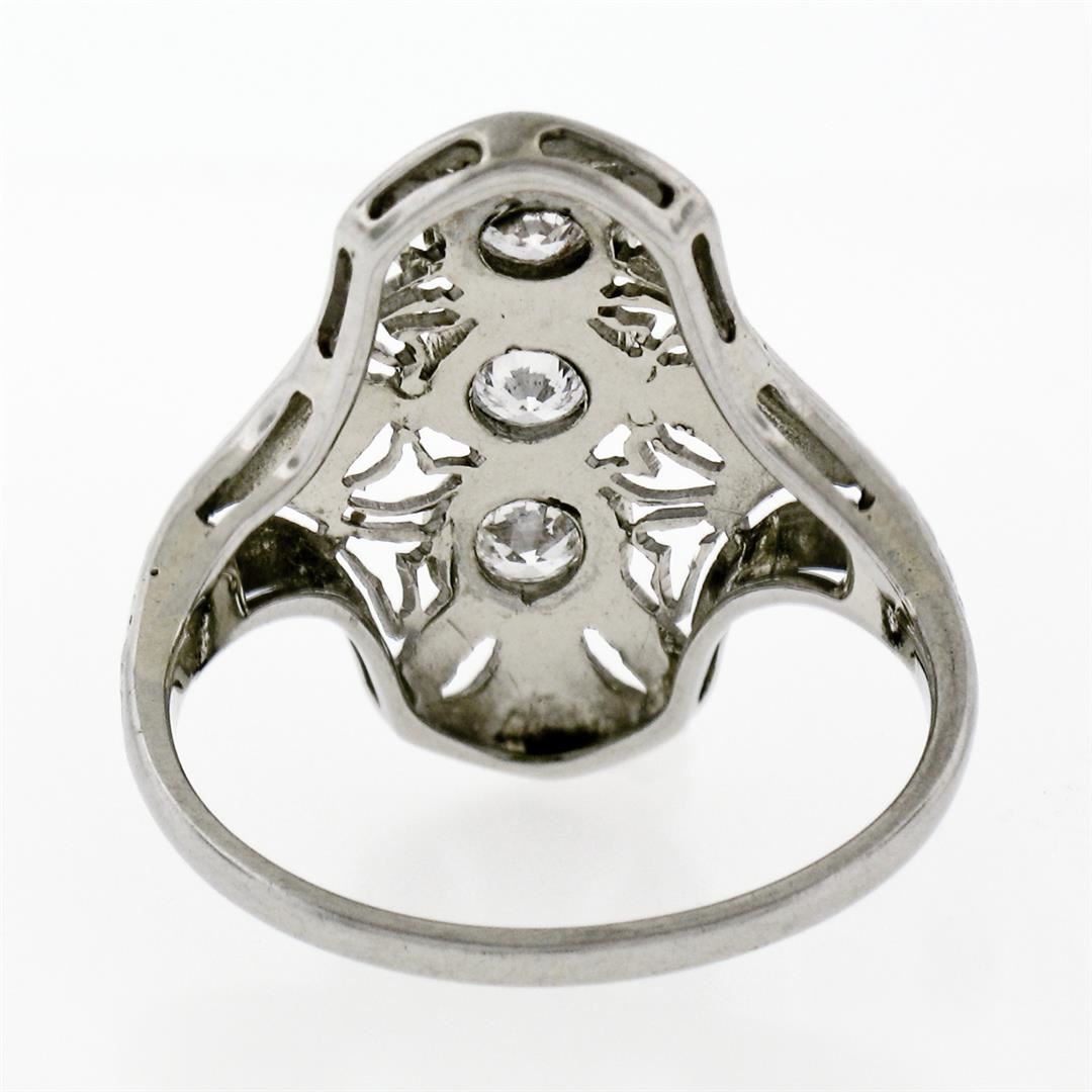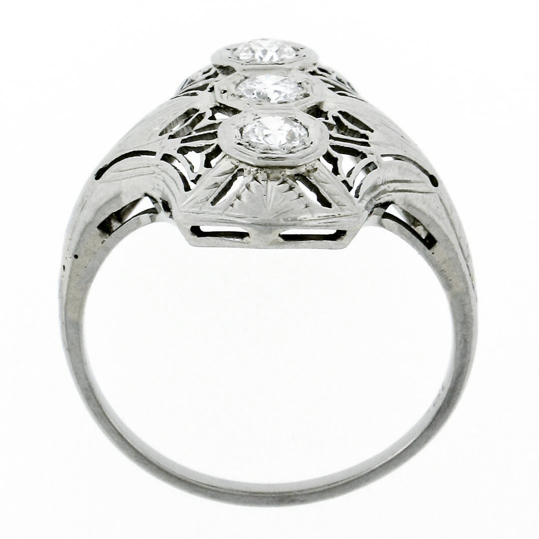 An antique solid 18k white gold filigree dinner ring, with 3 old european cut natural diamonds (G/H- VS2/SI1; 0.35ctw). The ring is size 6.0, weighs a total of 3.28 grams, and measures 20.50mm wide.