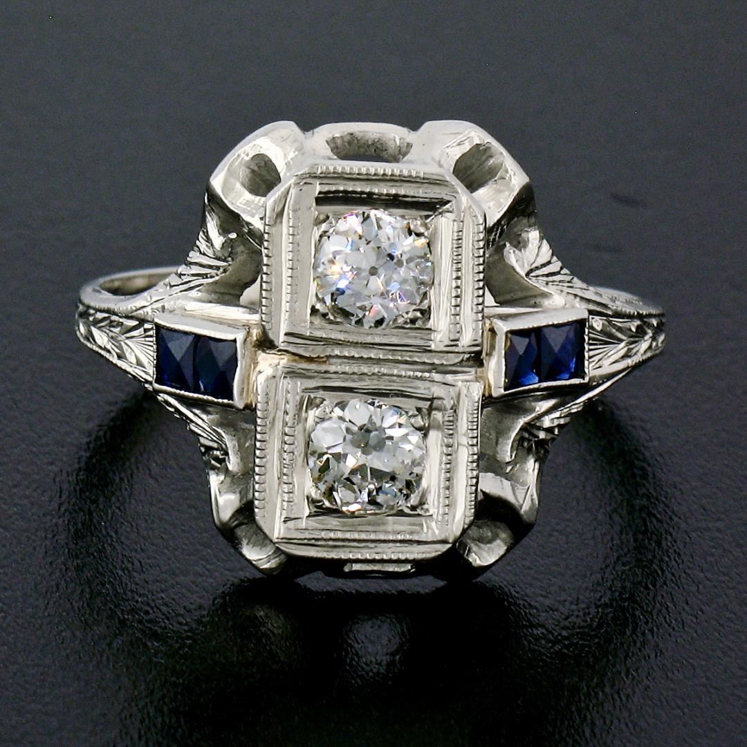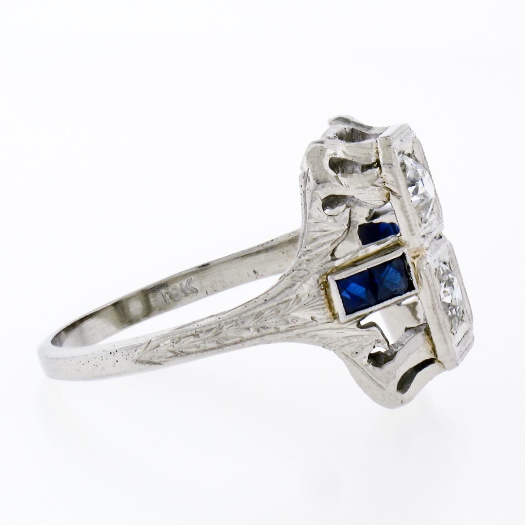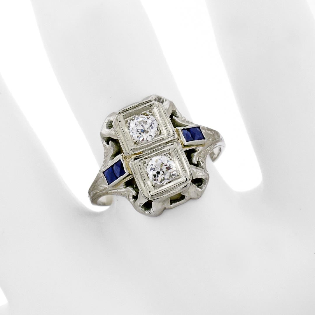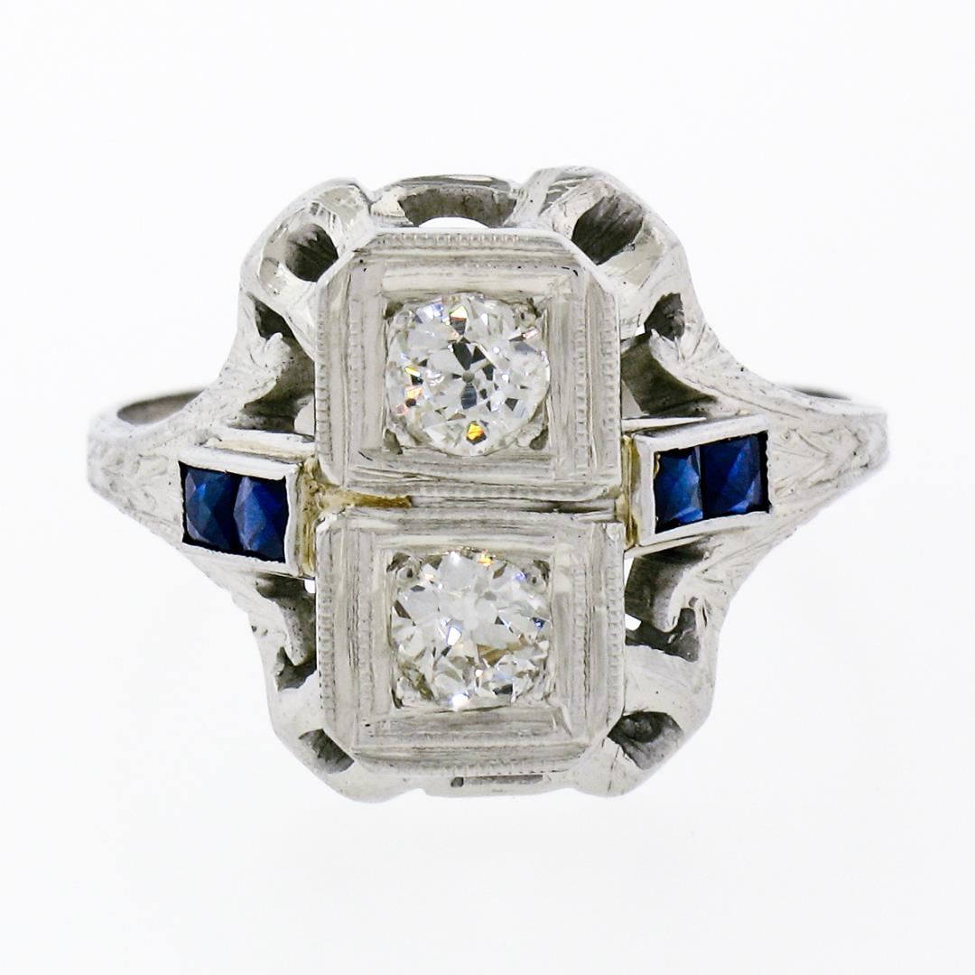 Antique Art Deco 18K White Gold .46ctw Diamond Sapphire Open Etched Dinner Ring