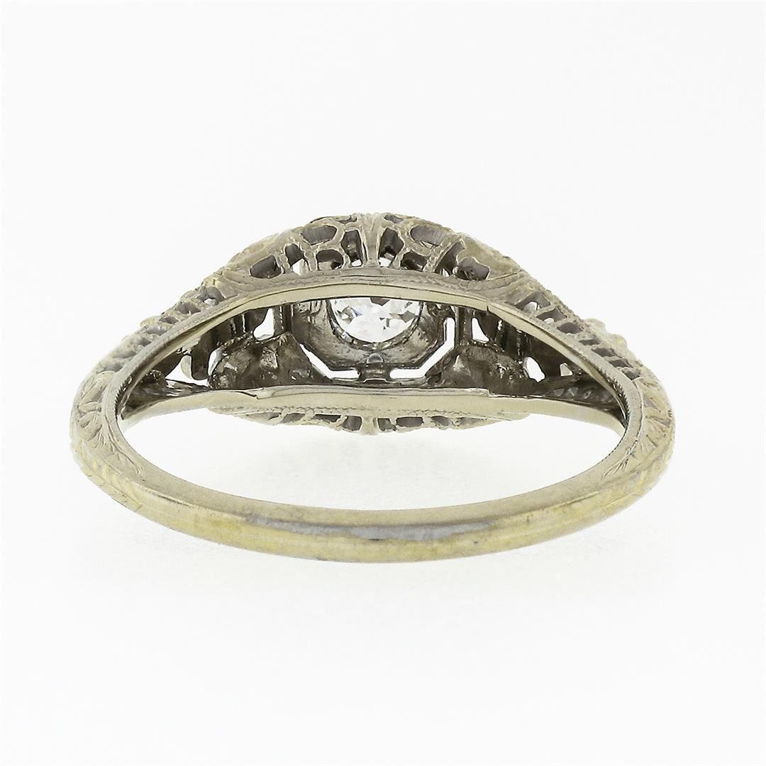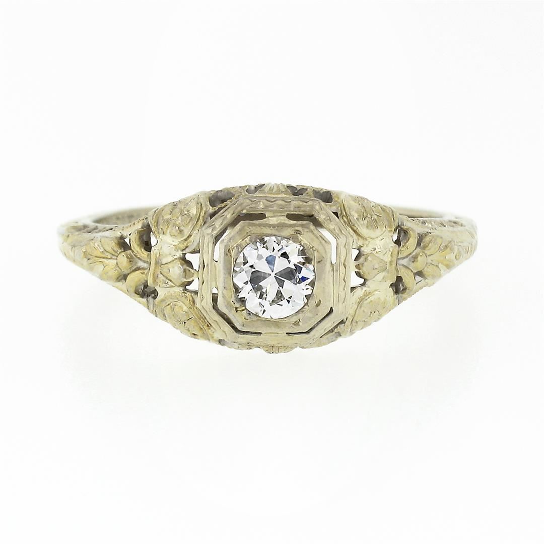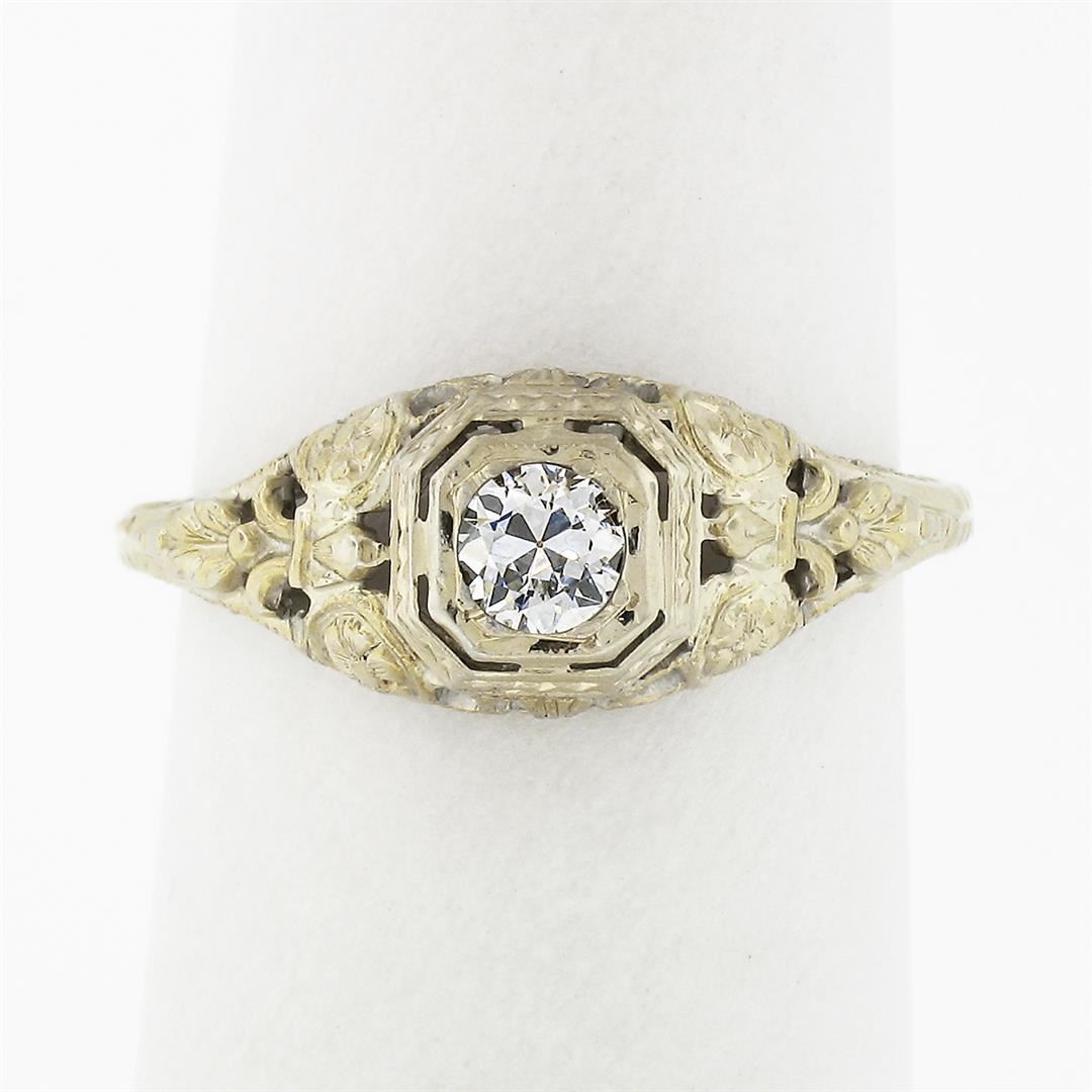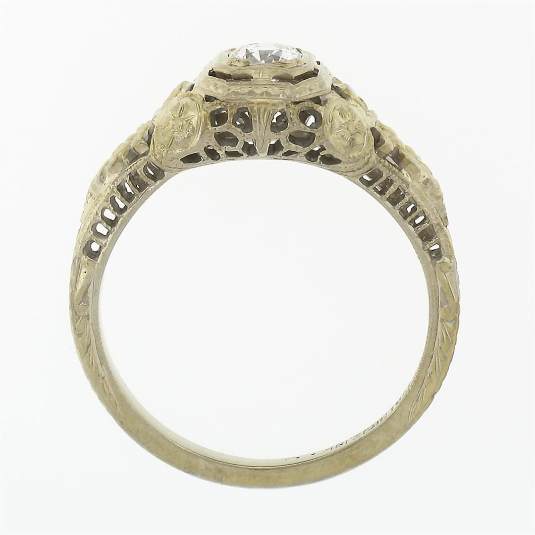 An antique art deco solid 18k white gold puffed band ring, with 1 old european cut natural diamond (F - VS1 ; 0.26 ct). The ring is size 6, weighs a total of 2.78 grams, and measures 7.85mm wide.