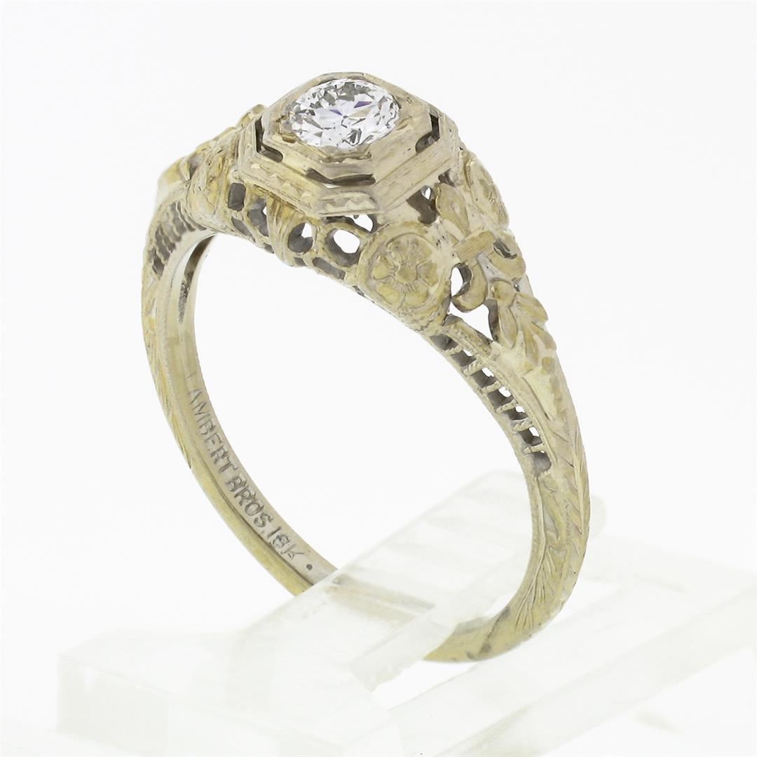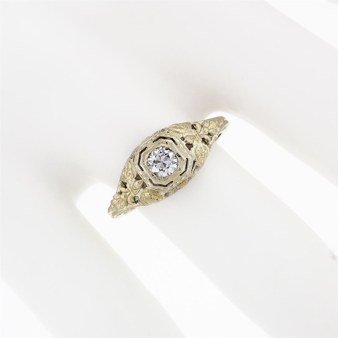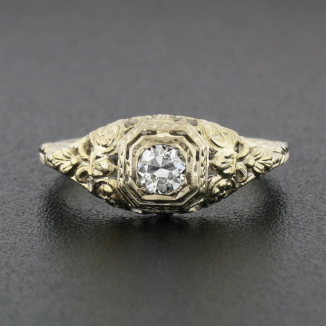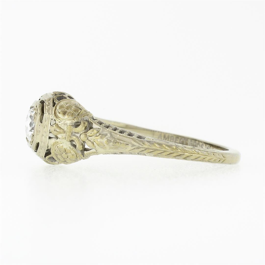 An antique art deco solid 18k white gold puffed band ring, with 1 old european cut natural diamond (F - VS1 ; 0.26 ct). The ring is size 6, weighs a total of 2.78 grams, and measures 7.85mm wide.