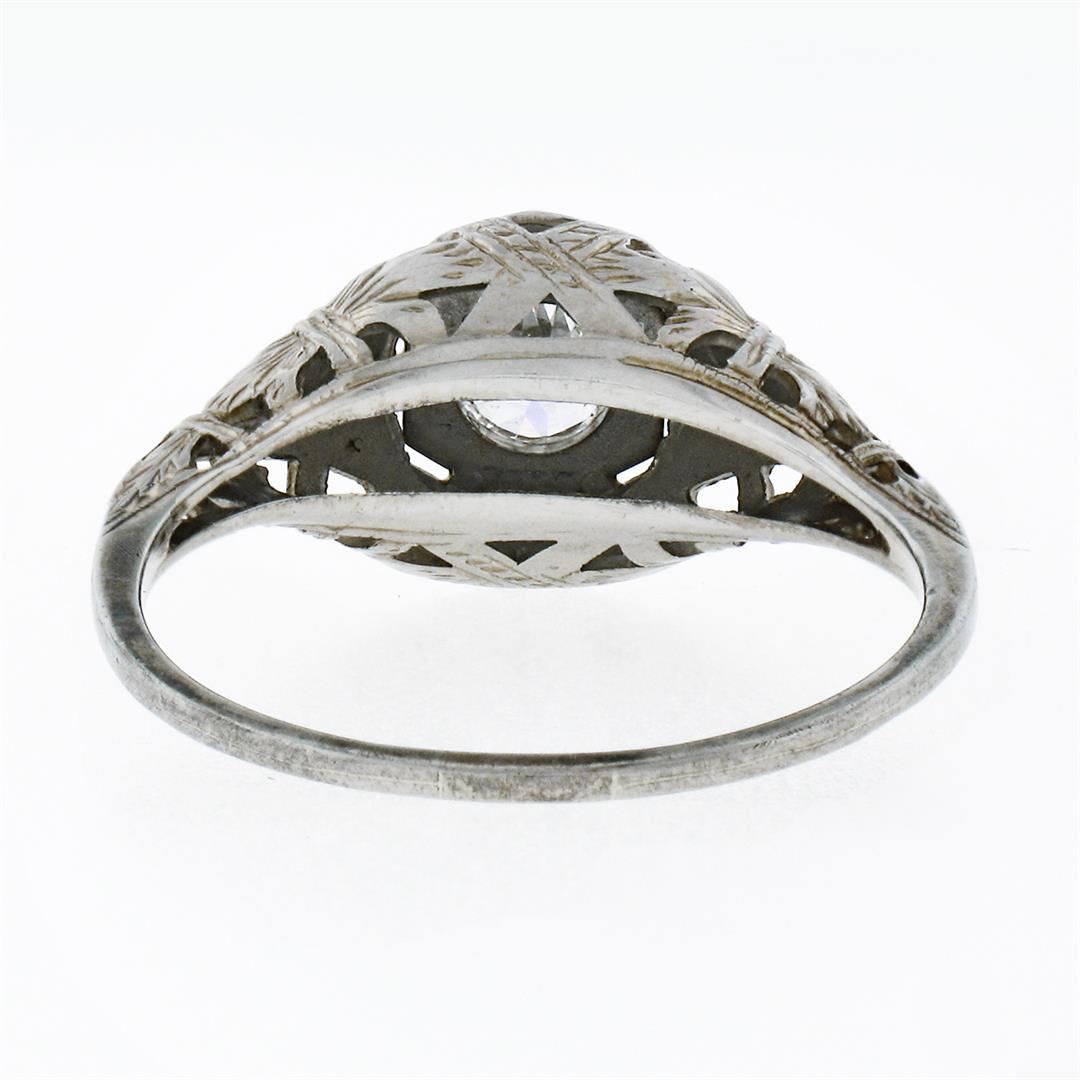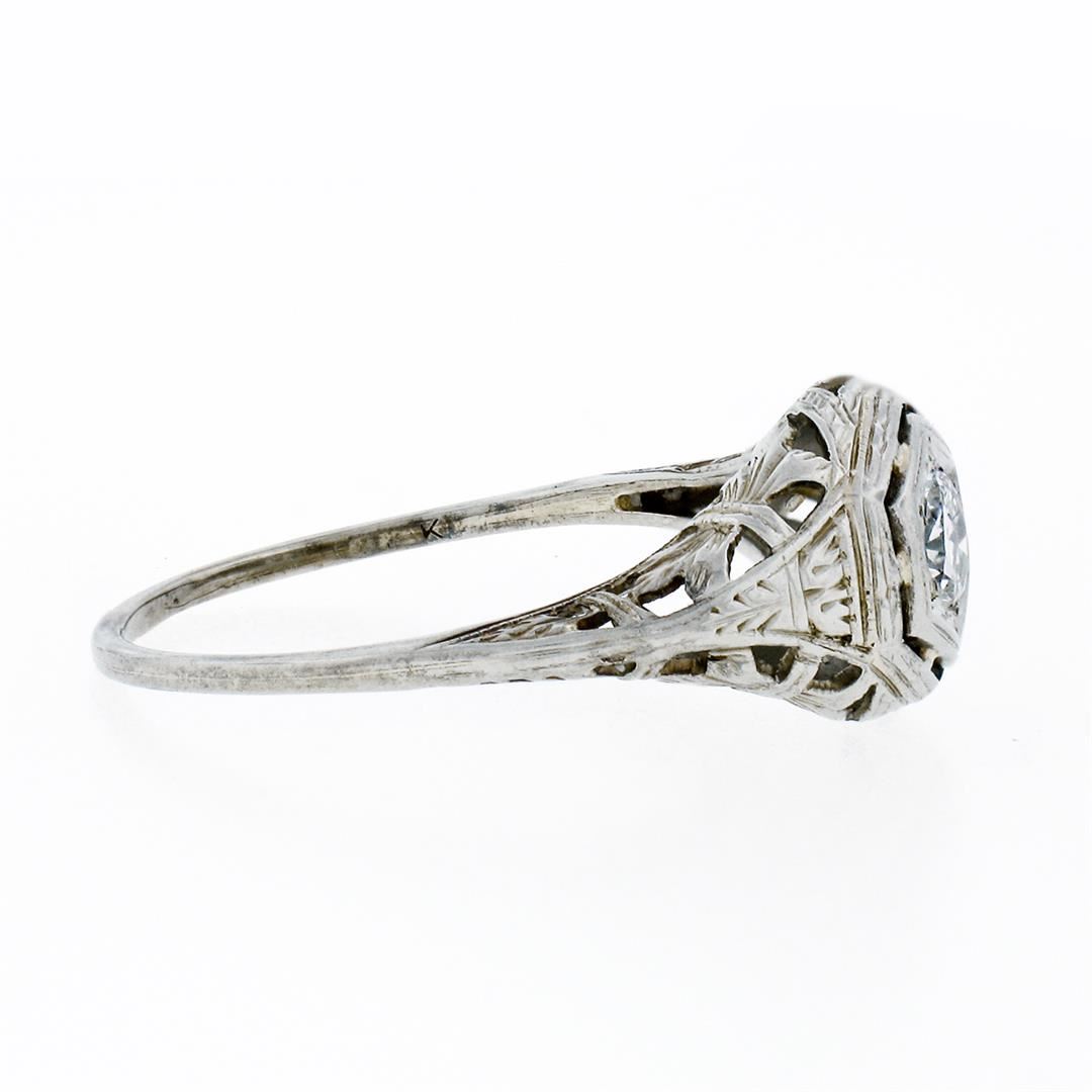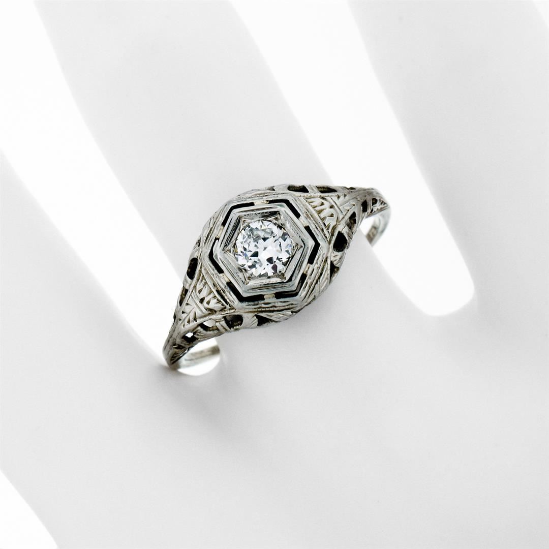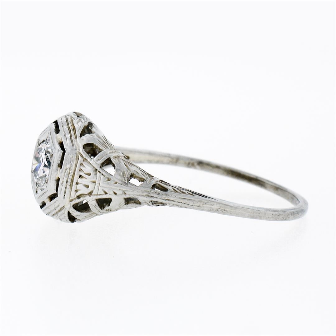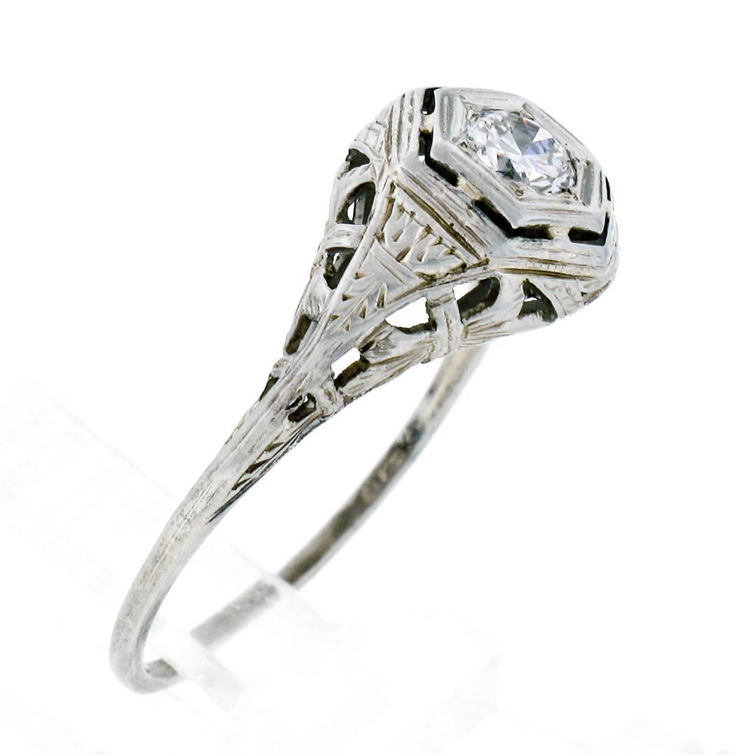An antique solid 18k white gold filigree ring, with 1 old european cut natural diamond (G- VS1; 0.26ctw). The ring is size 8.0, weighs a total of 2.4 grams, and measures 9.60mm wide.