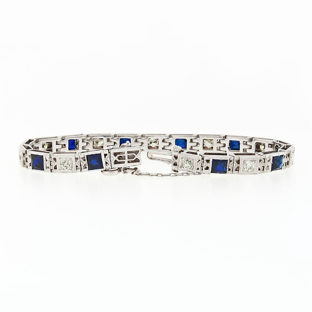 An art deco period solid 18k white gold line bracelet, with 10 old European cut natural diamonds (G/H - VS1/VS2; 1.10ctw), and 10 square french cut synthetic sapphire (3.5mm). It weighs a total of 12.77 grams, measures 4.85mm wide, and measures 5.75 inches in length.