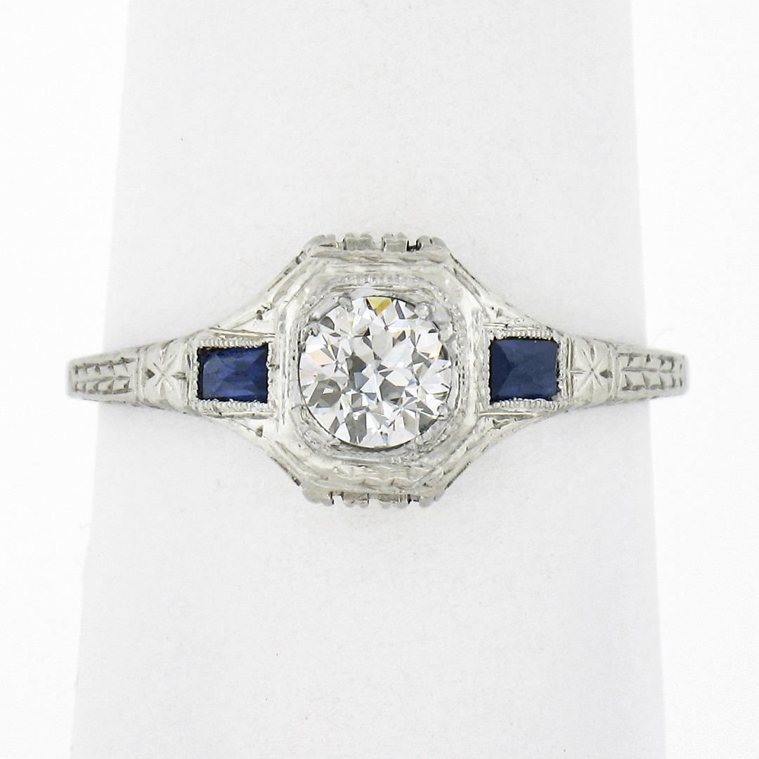 An antique art deco solid 18k white gold ring, with 1 old european cut natural diamond (G - VS2 ; 0.37ct), and 2 french baguette cut synthetic sapphires (3.3x1.9mm each). The ring is size 6.5, weighs a total of 2.54 grams, and measures 8mm wide.