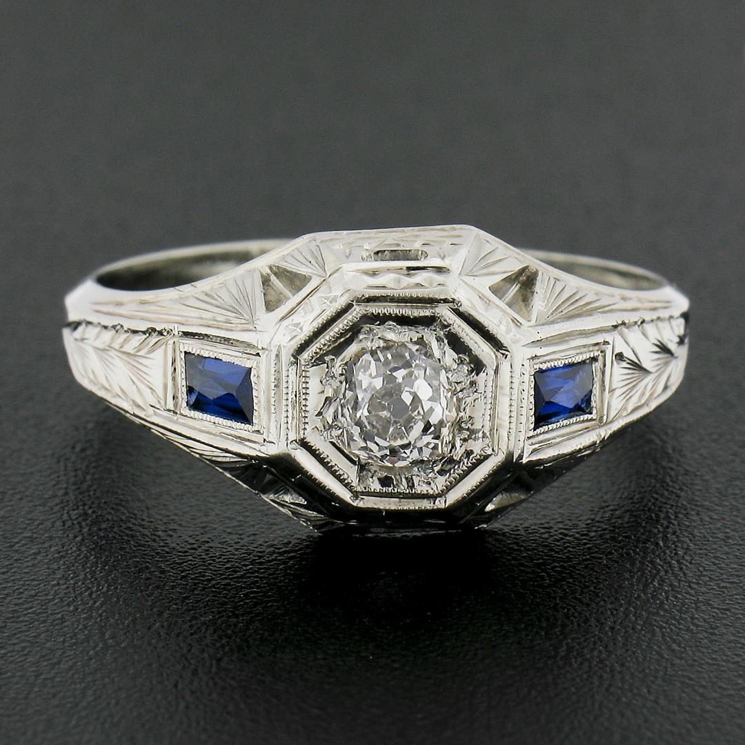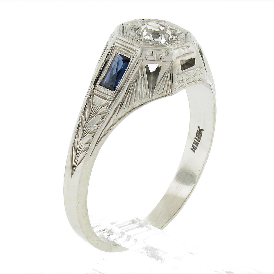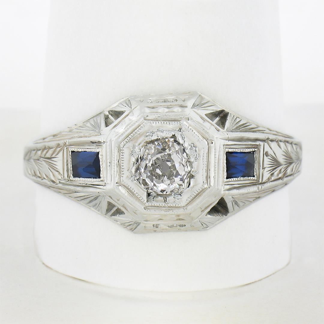 An antique solid 18k white gold engraved ring, with 2 french rectangular cut synthetic sapphires, and 1 old mine cut natural diamond (J - SI1 ; 0.40ct ). The ring is size 11, weighs a total of 6.65 grams, and measures10.9mm wide.