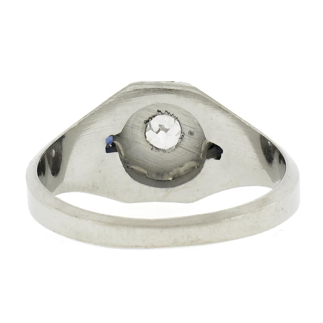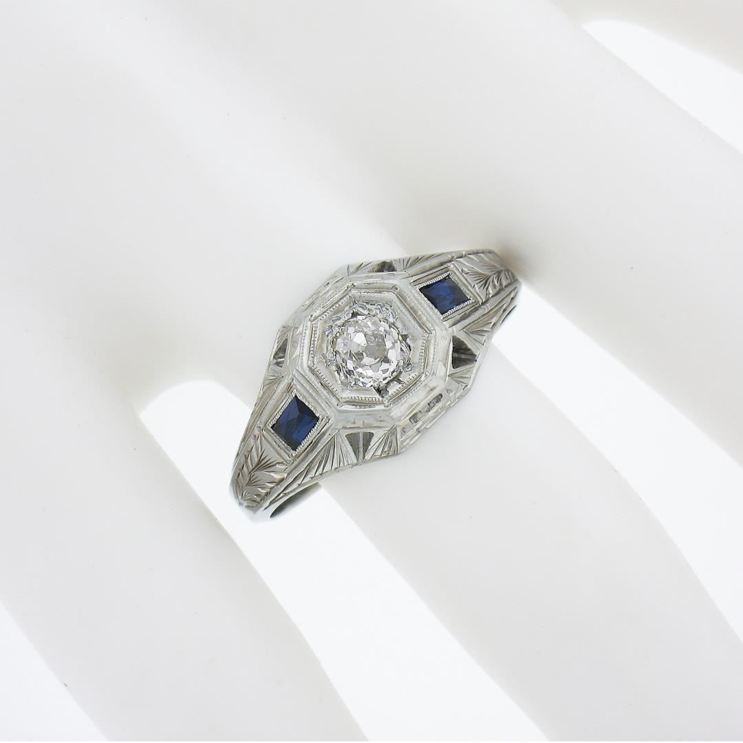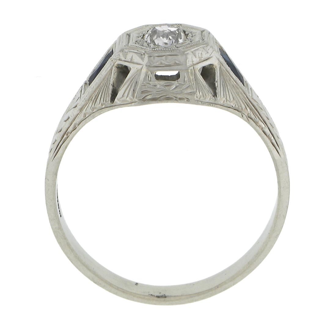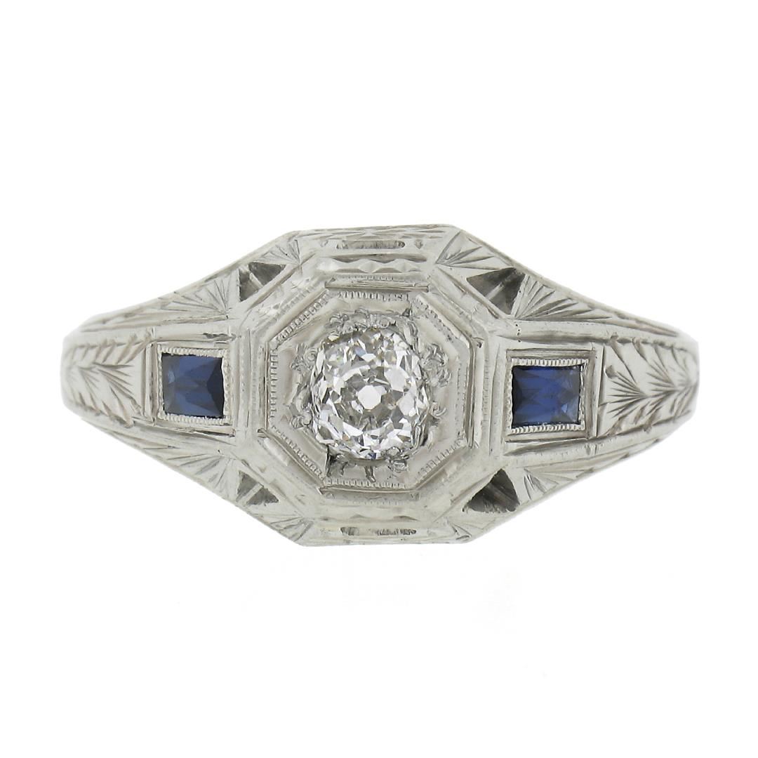 An antique solid 18k white gold engraved ring, with 2 french rectangular cut synthetic sapphires, and 1 old mine cut natural diamond (J - SI1 ; 0.40ct ). The ring is size 11, weighs a total of 6.65 grams, and measures10.9mm wide.