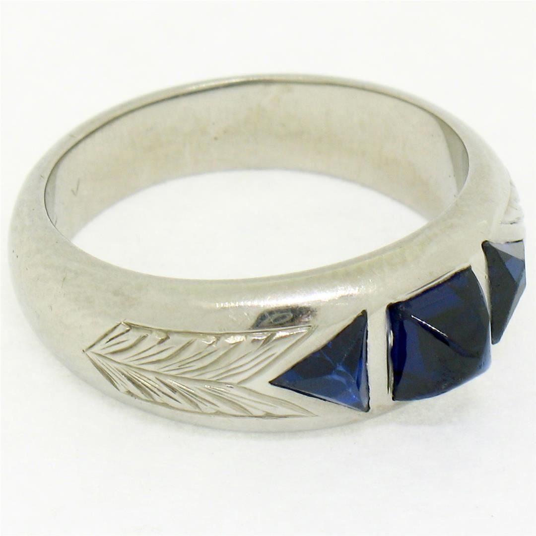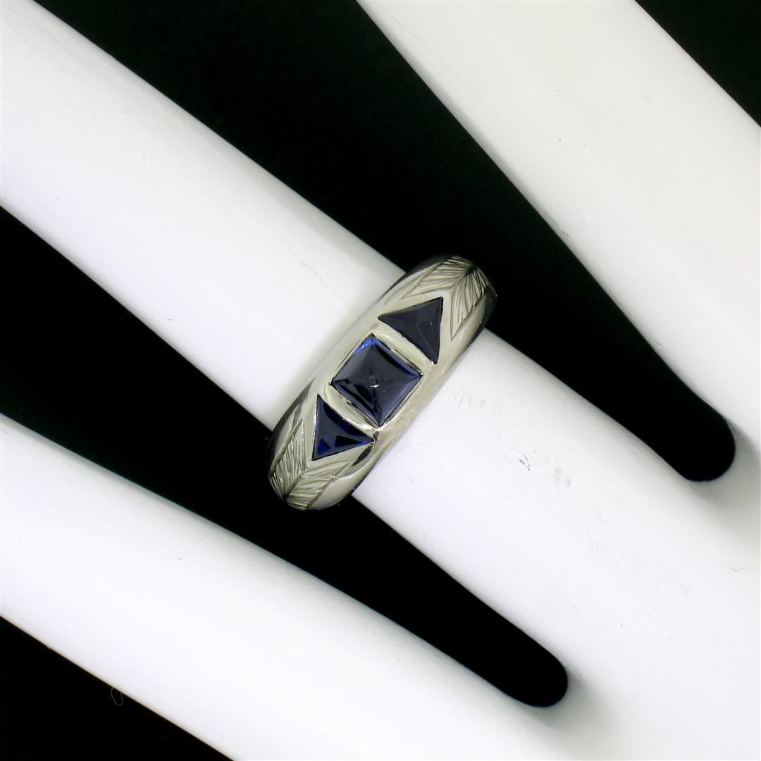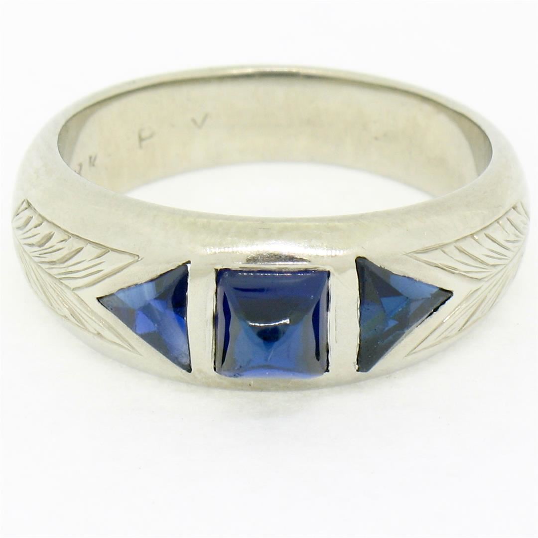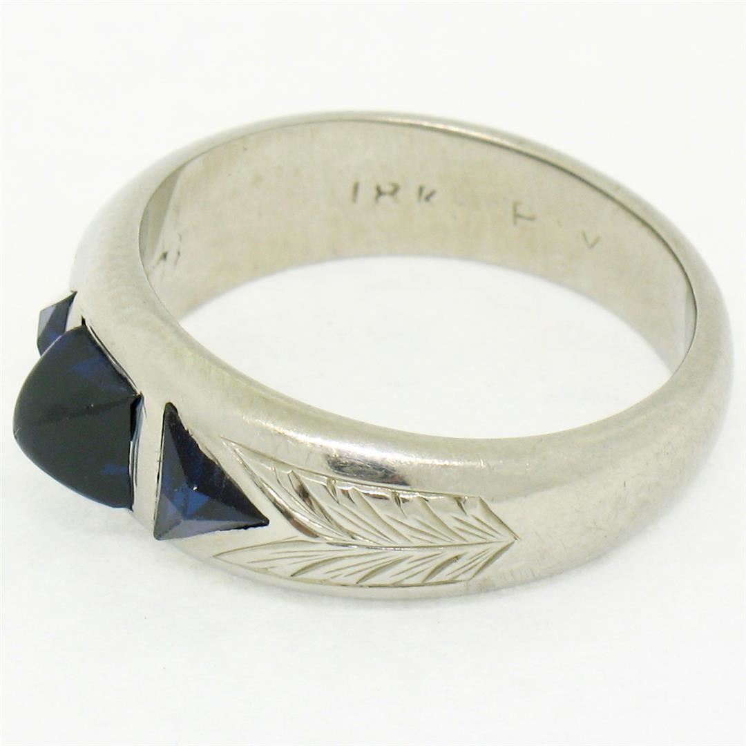 An antique solid 18k white gold band ring, with 1 sugarloaf cabochon cut natural sapphire (0.55ct), with 2 french trillion cut natural sapphires (0.35ctw). The ring is size 4.5, weighs a total of 5.38 grams, and measures 6.70mm wide.