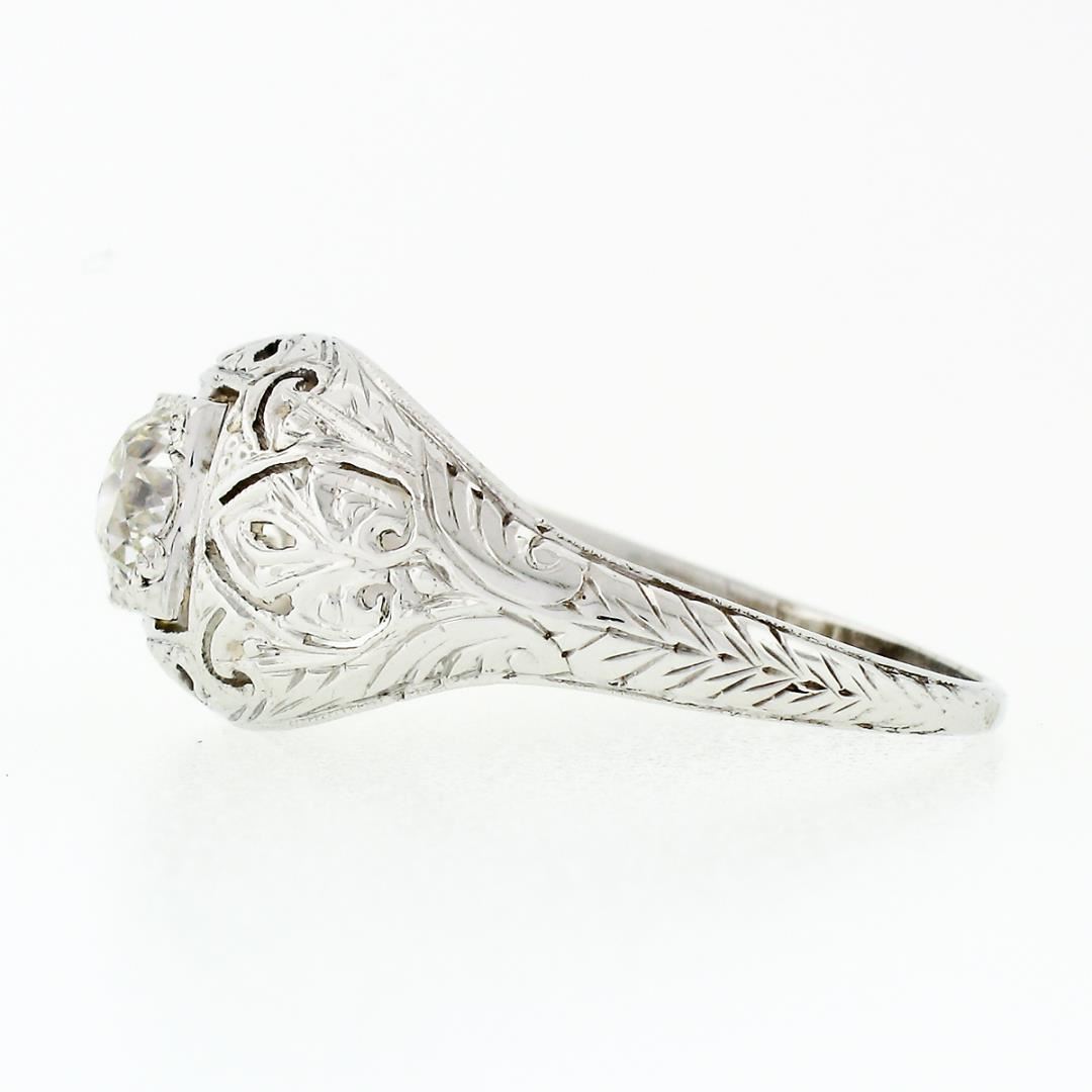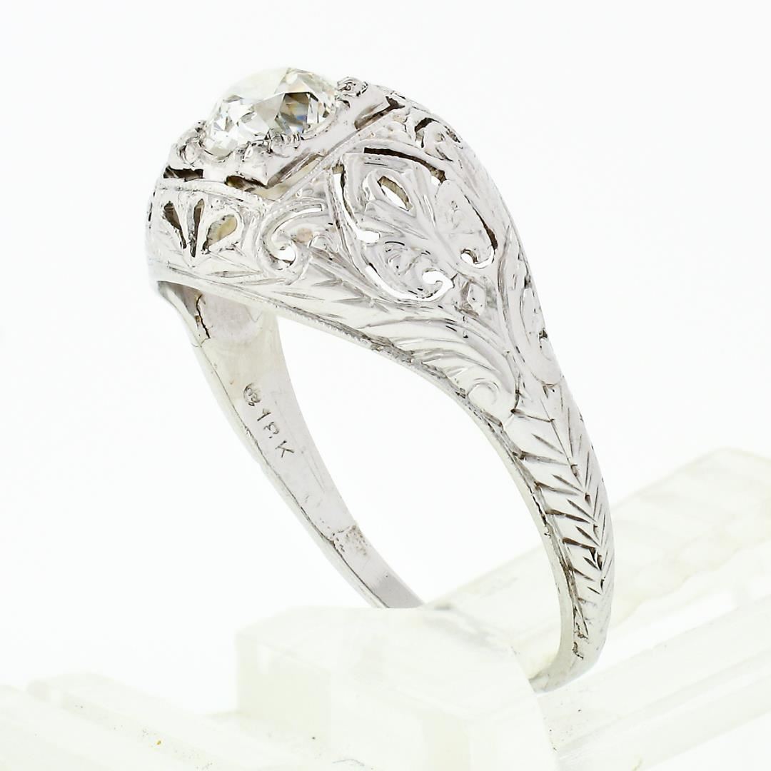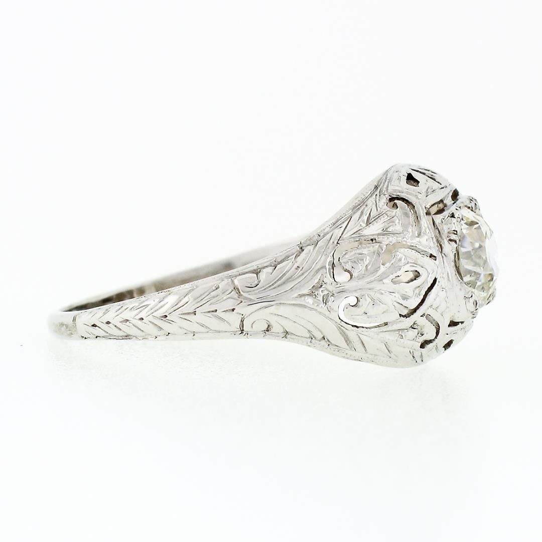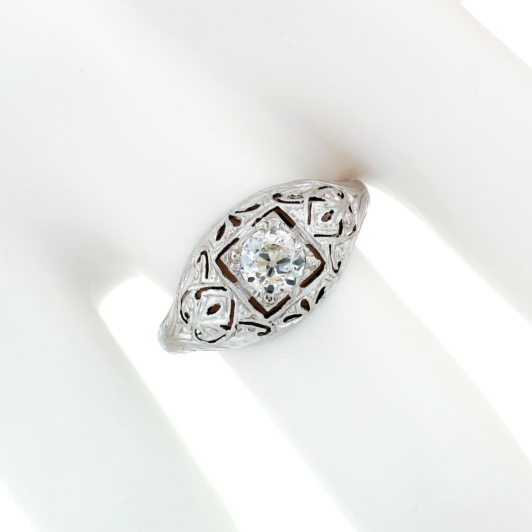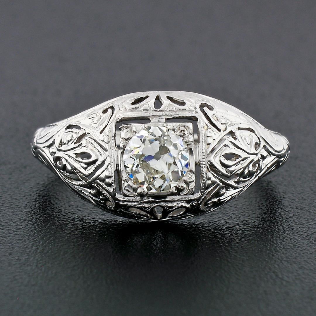 An antique solid 18k white gold ring, with 1 old european cut natural diamond (I - SI1 ; 0.52ct). The ring is size 7.0, weighs a total of 2.42 grams, and measures 9.8mm wide.