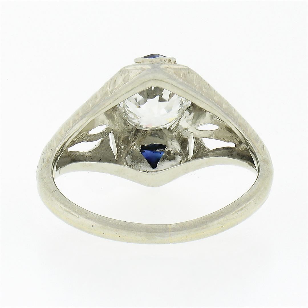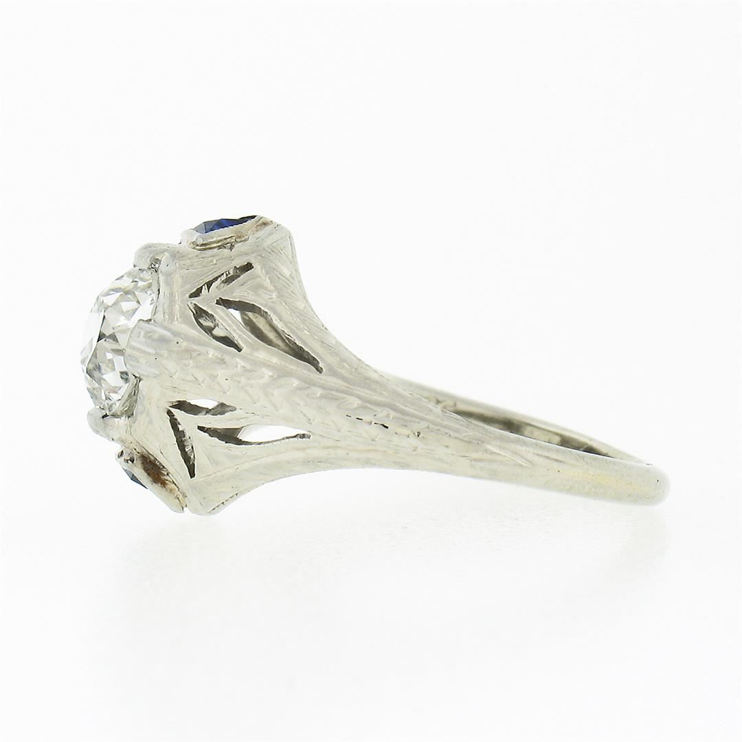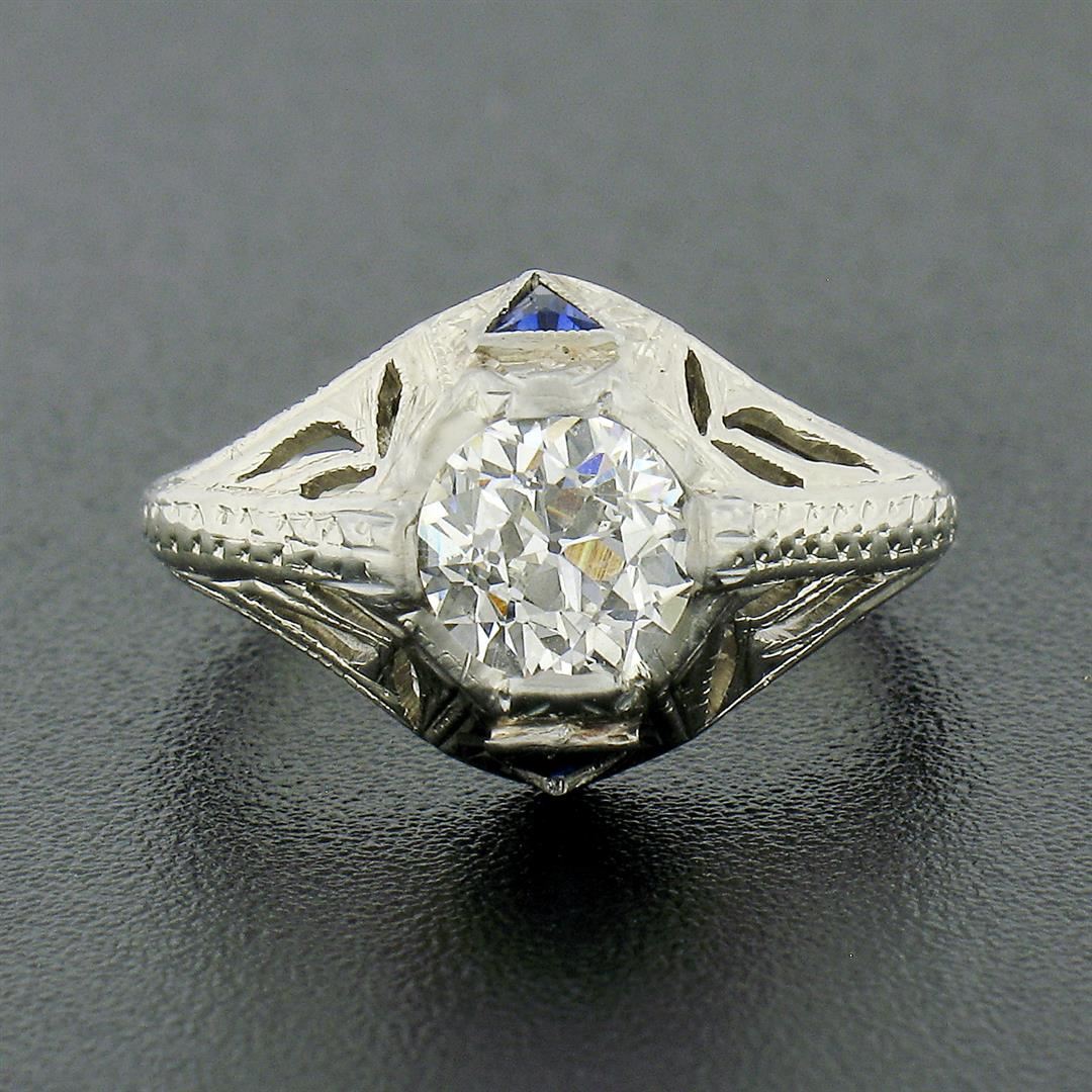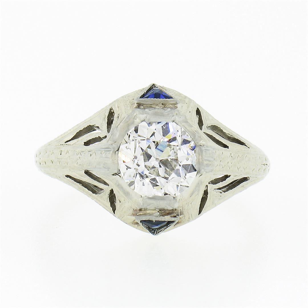 An antique solid 18k white gold engagement ring, with 1 gia certified old European cut natural diamond (SI1 ; J - 0.84ct), and 2 trillion French cut natural sapphires (0.20ctw). The ring is size 3.5, weighs a total of 2.72 grams, and measures 11.05mm wide. Comes with all original relevant certifications.