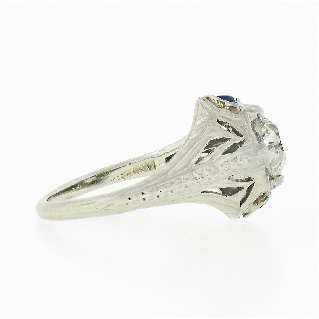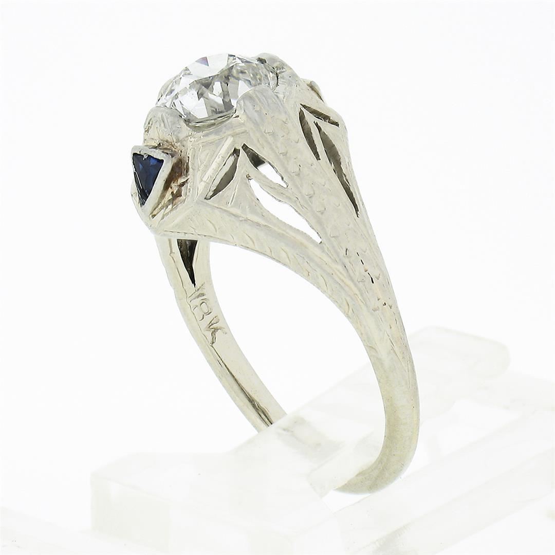 An antique solid 18k white gold engagement ring, with 1 gia certified old European cut natural diamond (SI1 ; J - 0.84ct), and 2 trillion French cut natural sapphires (0.20ctw). The ring is size 3.5, weighs a total of 2.72 grams, and measures 11.05mm wide. Comes with all original relevant certifications.