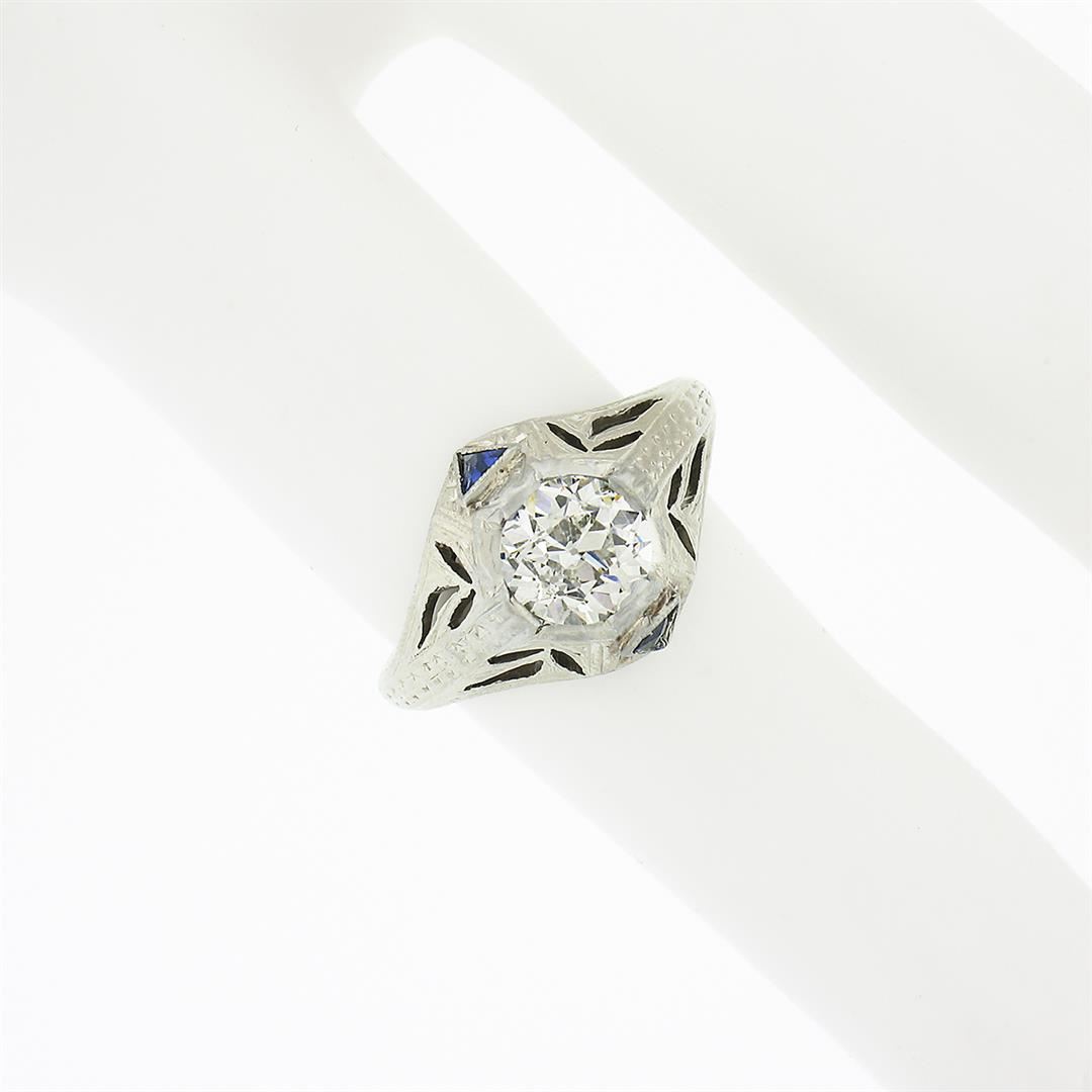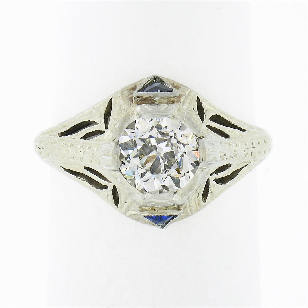 An antique solid 18k white gold engagement ring, with 1 gia certified old European cut natural diamond (SI1 ; J - 0.84ct), and 2 trillion French cut natural sapphires (0.20ctw). The ring is size 3.5, weighs a total of 2.72 grams, and measures 11.05mm wide. Comes with all original relevant certifications.