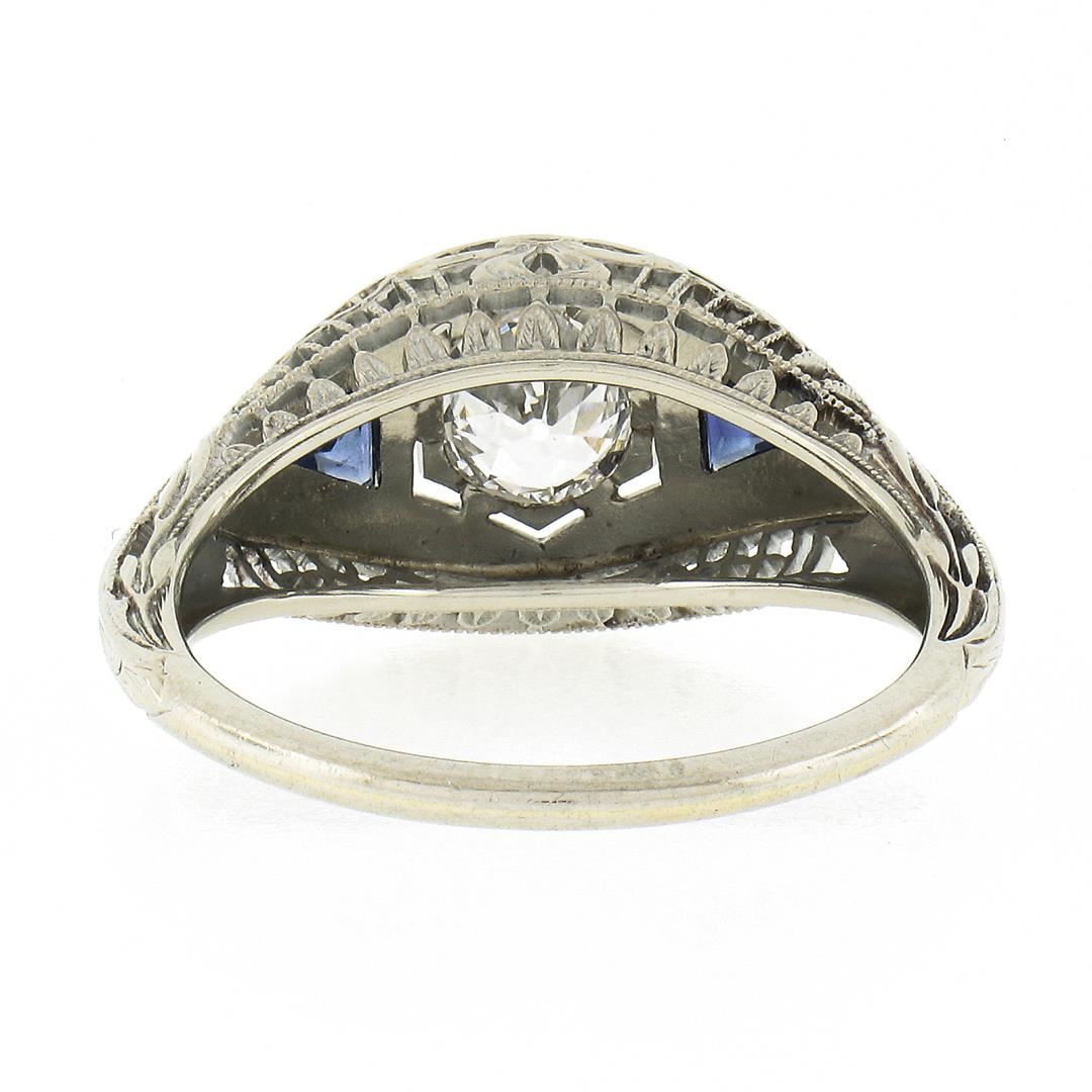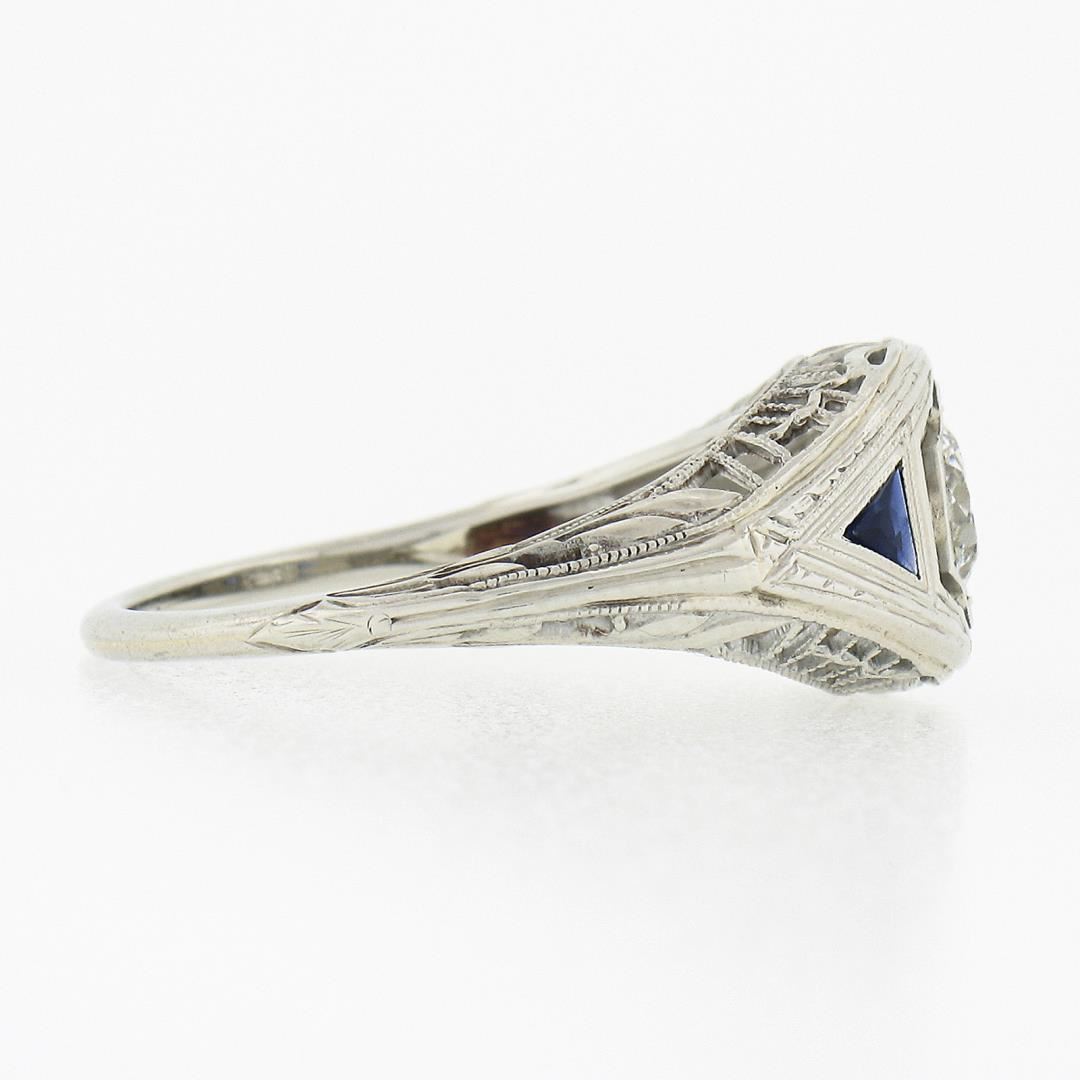 An antique solid 18k white gold ring, with 1 old European cut natural diamond (G - VS2 ; 0.50ct), and 2 trillion cut synthetic sapphire (3.2x3.2mm each). The ring is size 6.0, weighs a total of 2.90 grams, and measures 9.30mm wide.