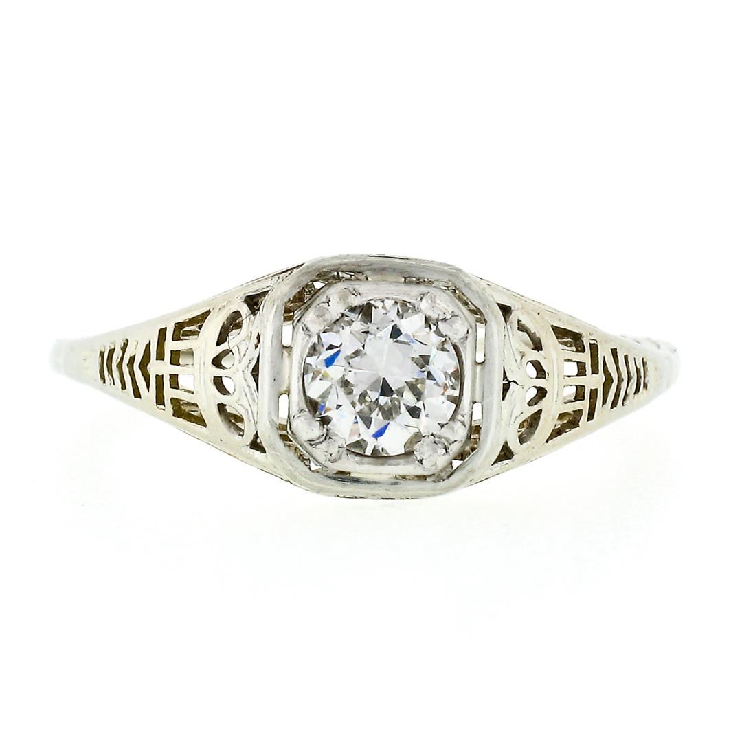 An art deco period 18k white gold filigree solitaire ring, with 1 old European cut natural diamond (H - VS1; 0.45ct). The ring is size 6.0, weighs a total of 1.94 grams, and measures 7.1mm wide.