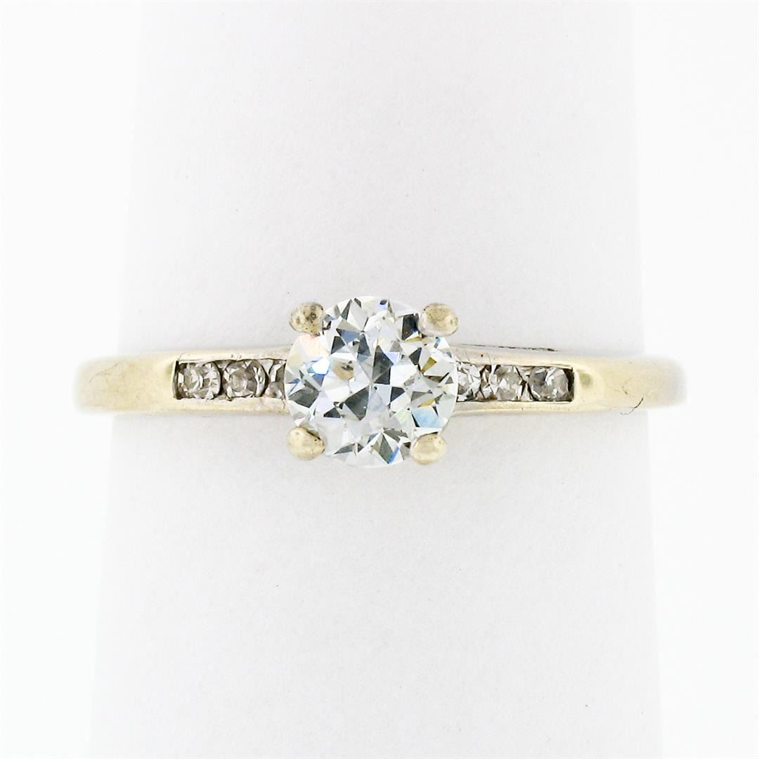 An antique art deco solid 18k white gold solitaire ring, featuring 1 old european cut natural diamond (F - VS2 ; 0.45ct), and 6 round single cut natural diamonds (F/G - VS1/VS2 ; 0.10ctw). The ring is size 5, weighs a total of 1.76 grams, and measures 4.83mm wide.