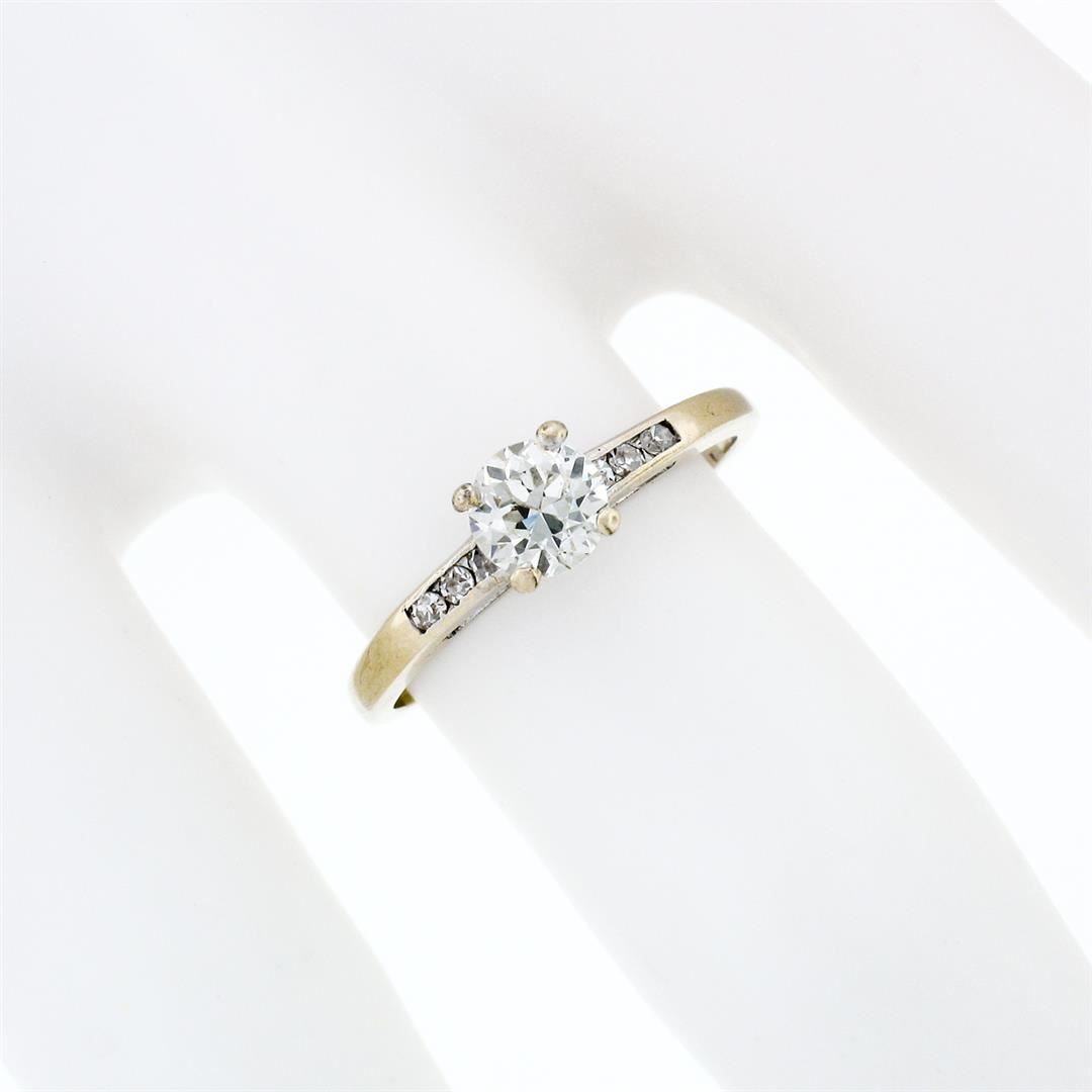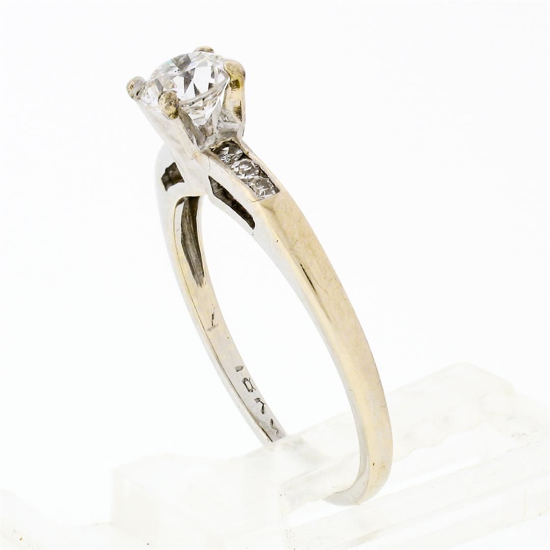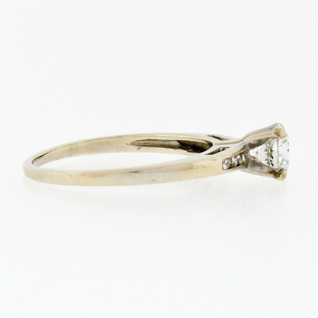 An antique art deco solid 18k white gold solitaire ring, featuring 1 old european cut natural diamond (F - VS2 ; 0.45ct), and 6 round single cut natural diamonds (F/G - VS1/VS2 ; 0.10ctw). The ring is size 5, weighs a total of 1.76 grams, and measures 4.83mm wide.