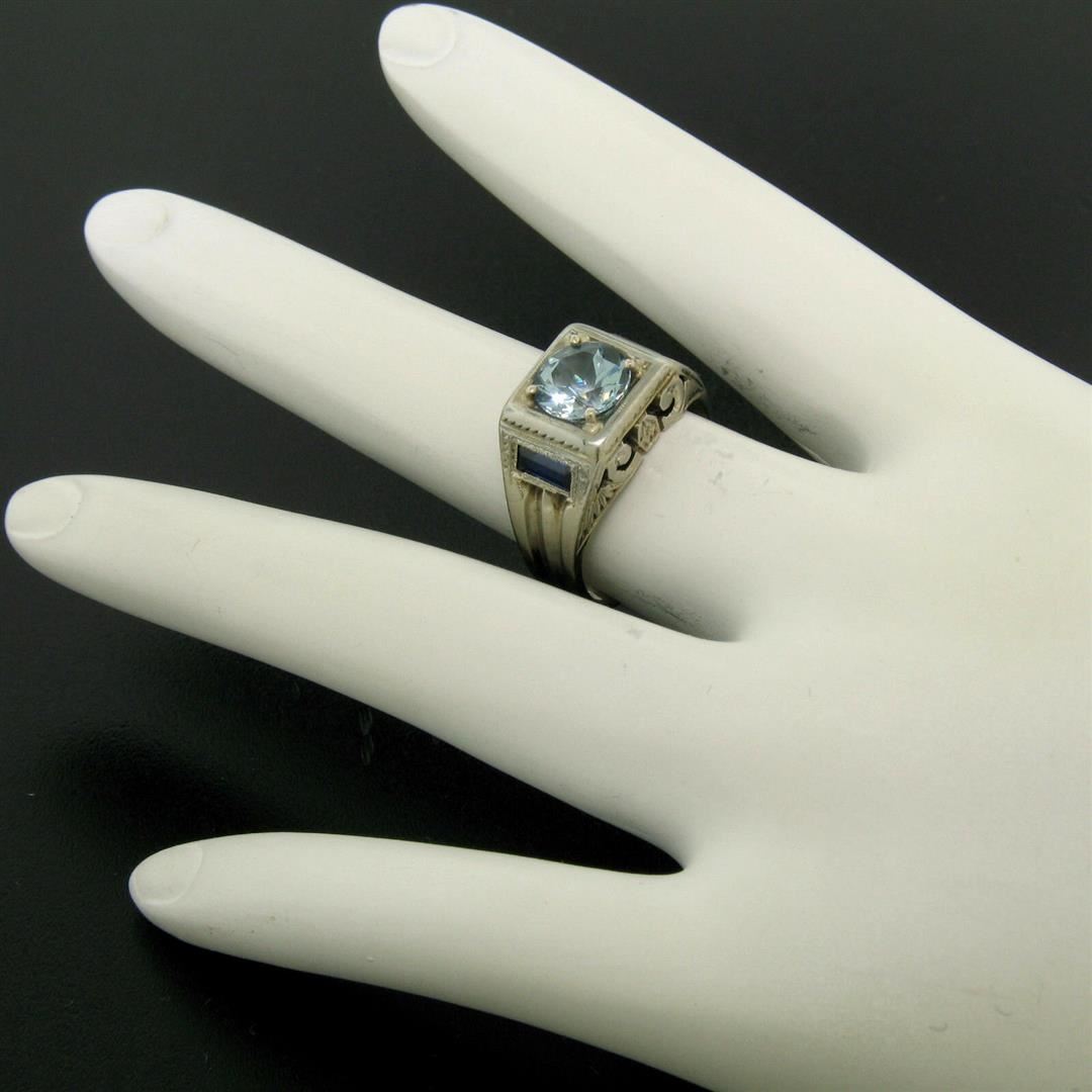 An excellent condition antique 18k white gold ring with a 1.25ct round aquamarine flanked by two synthetic sapphires. The ring is a size 6.0, weighs a total of 7.20 grams, and is 10.45mm wide.