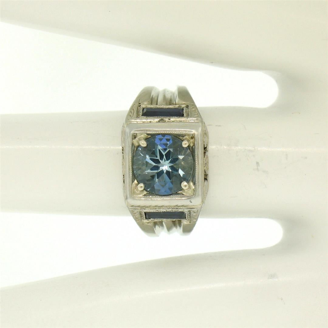 An excellent condition antique 18k white gold ring with a 1.25ct round aquamarine flanked by two synthetic sapphires. The ring is a size 6.0, weighs a total of 7.20 grams, and is 10.45mm wide.