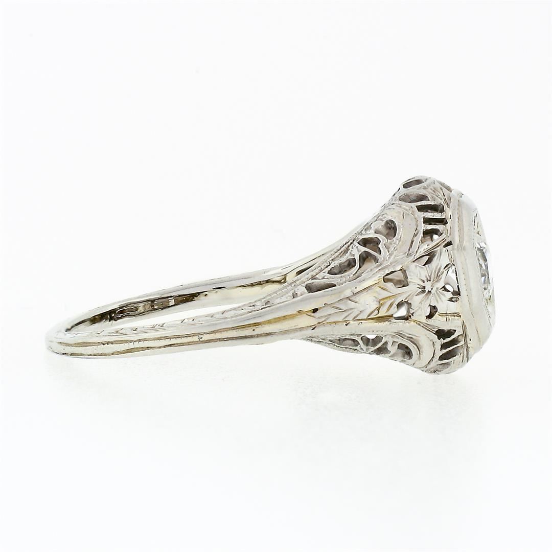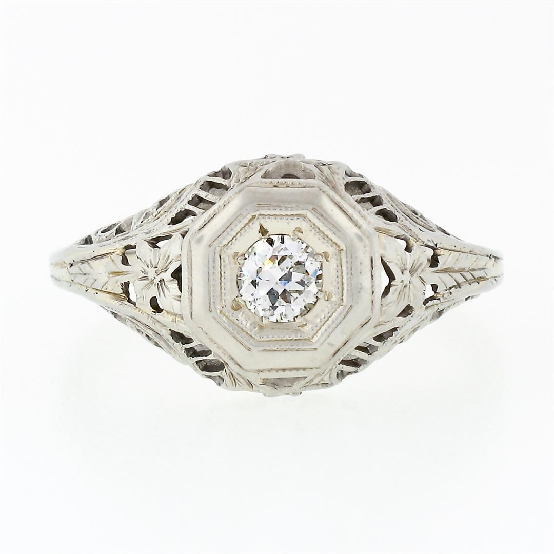 An antique solid 18k white gold engagement ring, with 1 old european cut natural diamond (G- SI1; 0.21ct). The ring is size 5.0, weighs a total of 2.66 grams, and measures 9.74mm wide.