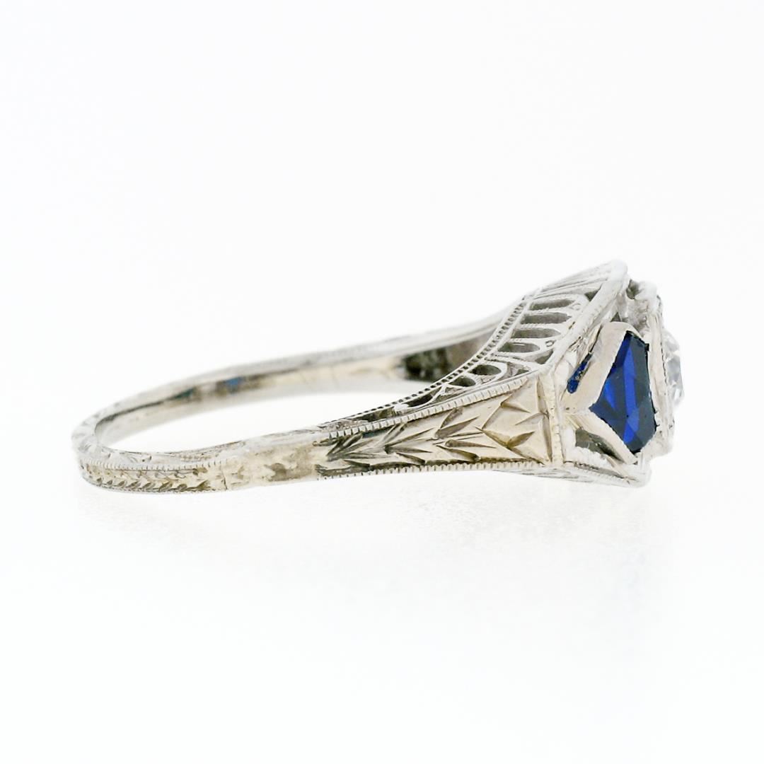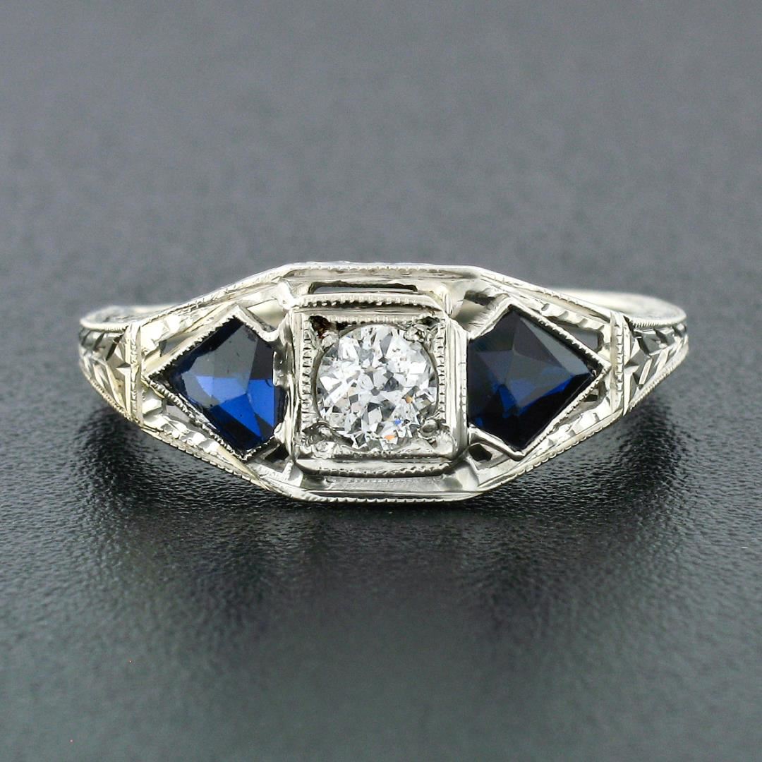 An antique solid 18k white gold ring, with 1 old European cut natural diamond (G - SI2 ; 0.22ct), and 2 shield cut synthetic sapphires. The ring is size 4.5, weighs a total of 2.13 grams, and measures 7.24mm wide.