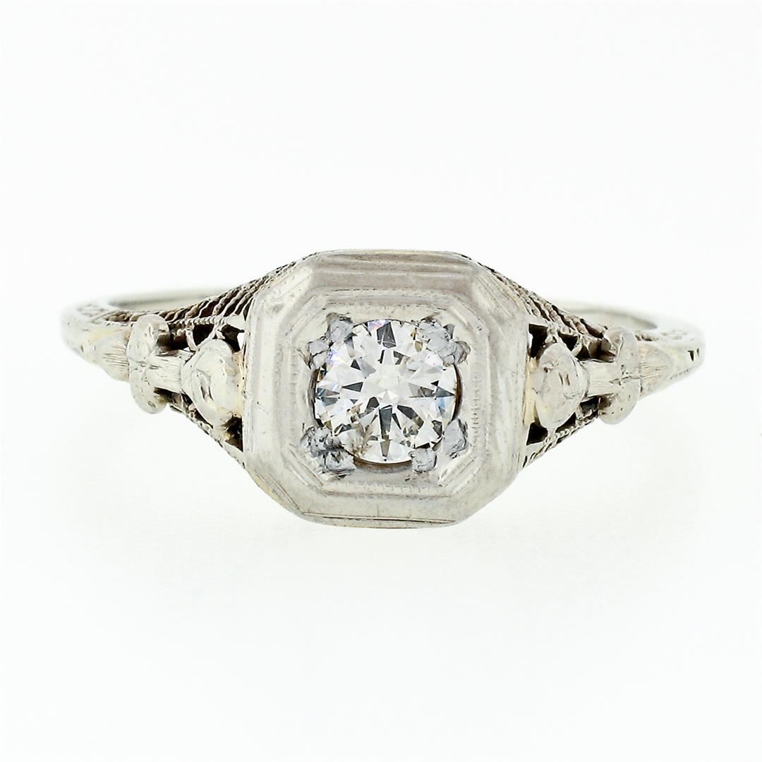 An art deco period solid 18k white gold filigree work engagement ring, with 1 old European cut natural diamond (G - SI1; 0.26ct). The ring is size 6.0, weighs a total of 2.30 grams, and measures 8mm wide.