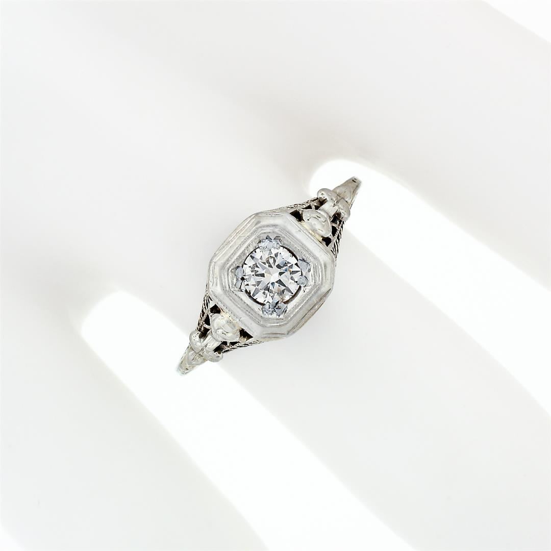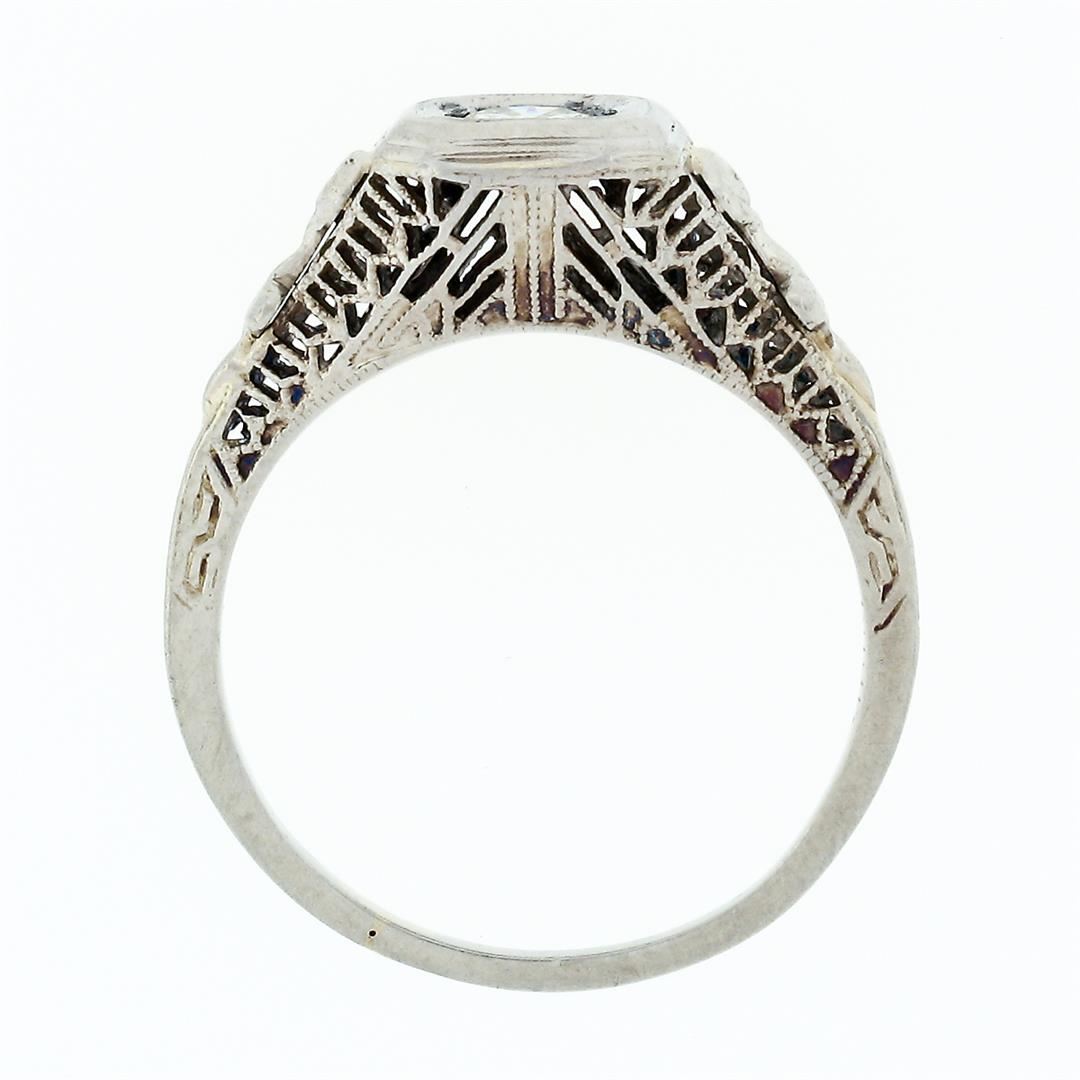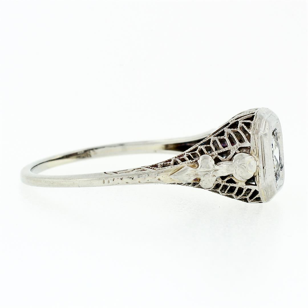 An art deco period solid 18k white gold filigree work engagement ring, with 1 old European cut natural diamond (G - SI1; 0.26ct). The ring is size 6.0, weighs a total of 2.30 grams, and measures 8mm wide.