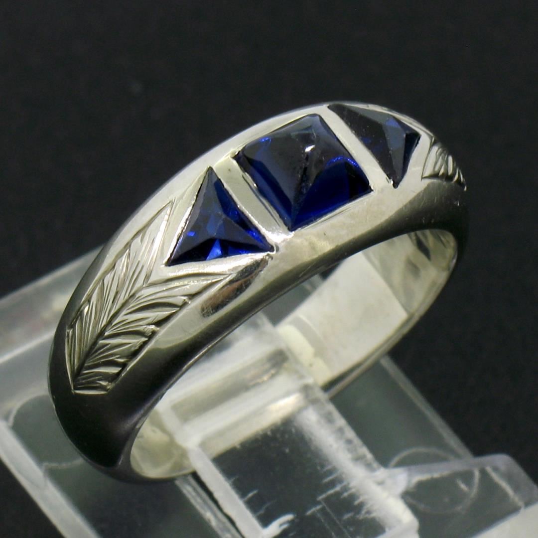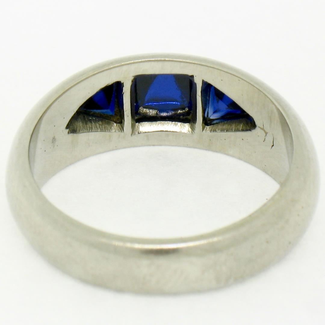 An antique solid 18k white gold band ring, with 1 sugarloaf cabochon cut synthitic sapphire (3.9mm), and 2 french trillion cut synthetic sapphires (4mm). The ring is size 4.5, weighs a total of 5.38 grams, and measures 6.70mm wide.