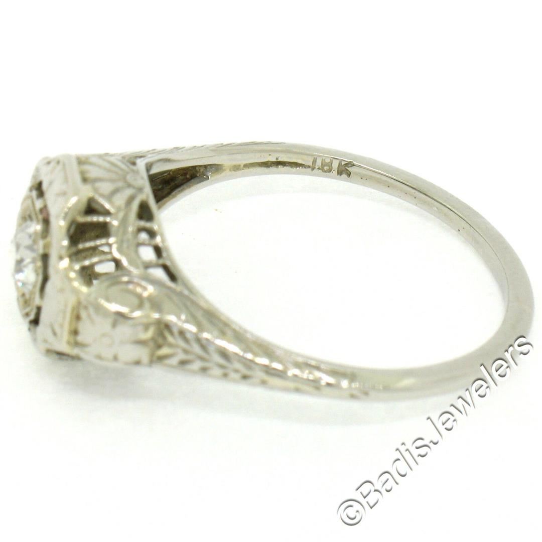An excellent condition antique 18kt white gold engagement ring bead set with a 0.35ct old European cut diamond (E - VS1). The ring is size 8, weighs a total of 3.06 grams, and measures 10.0mm wide.