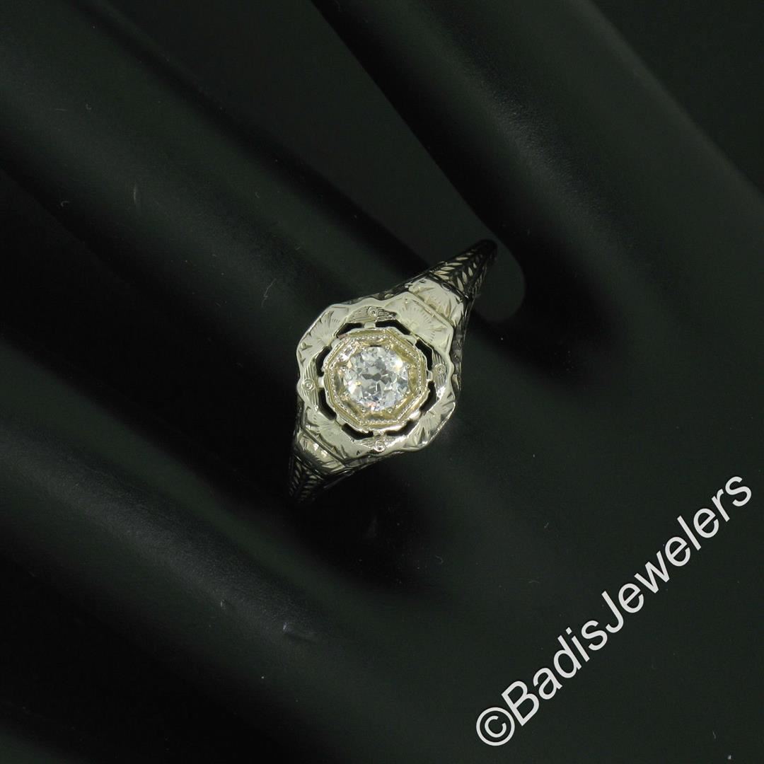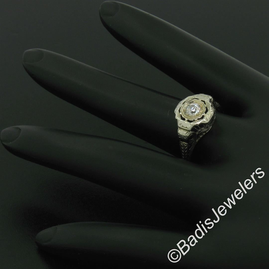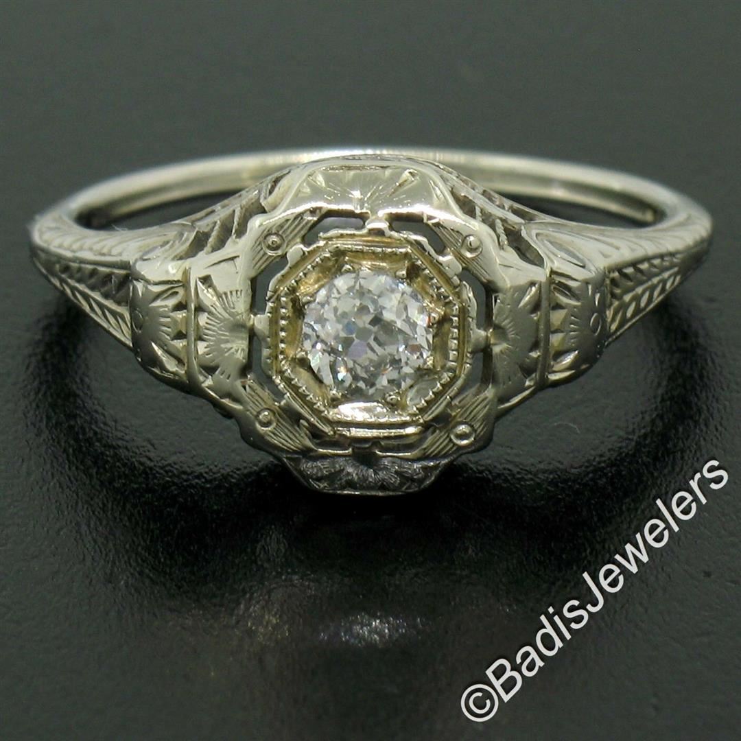 An excellent condition antique 18kt white gold engagement ring bead set with a 0.35ct old European cut diamond (E - VS1). The ring is size 8, weighs a total of 3.06 grams, and measures 10.0mm wide.