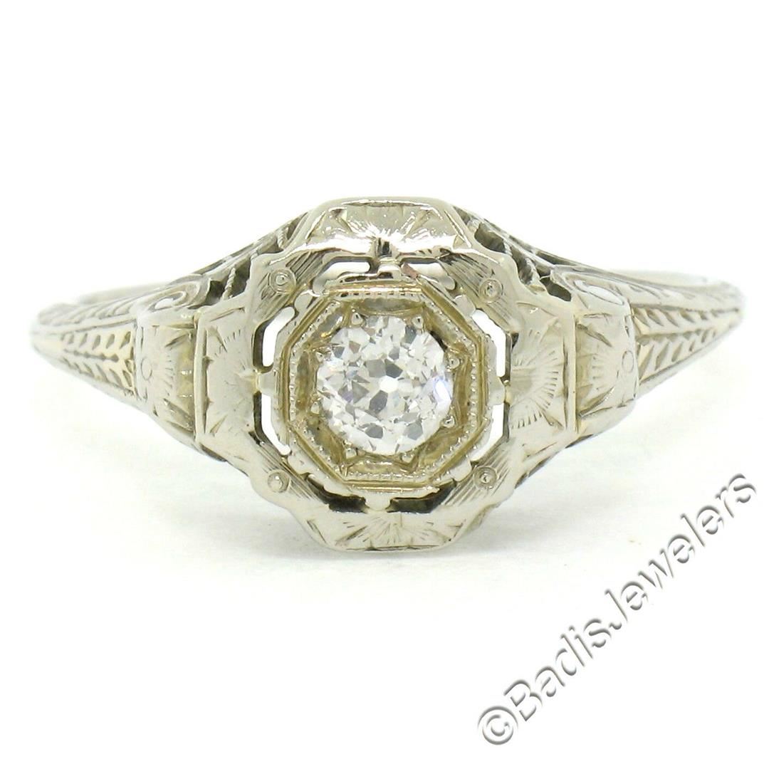 An excellent condition antique 18kt white gold engagement ring bead set with a 0.35ct old European cut diamond (E - VS1). The ring is size 8, weighs a total of 3.06 grams, and measures 10.0mm wide.