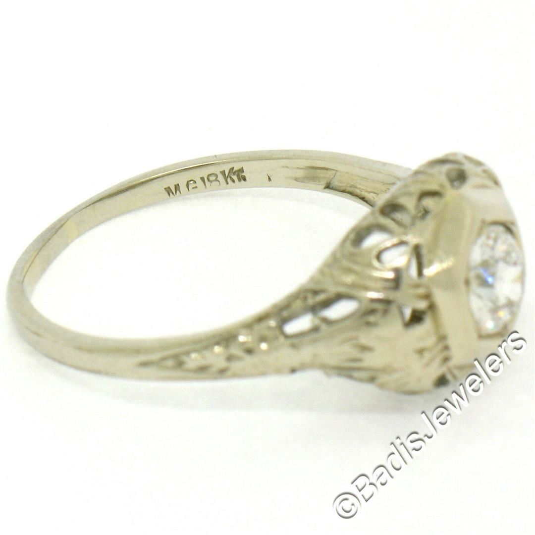 An excellent condition antique 18kt white gold ring bead set with a 0.42ct old European cut diamond (F - VS2). The ring is size 4, weighs a total of 2.3 grams, and measures 9.15mm wide.