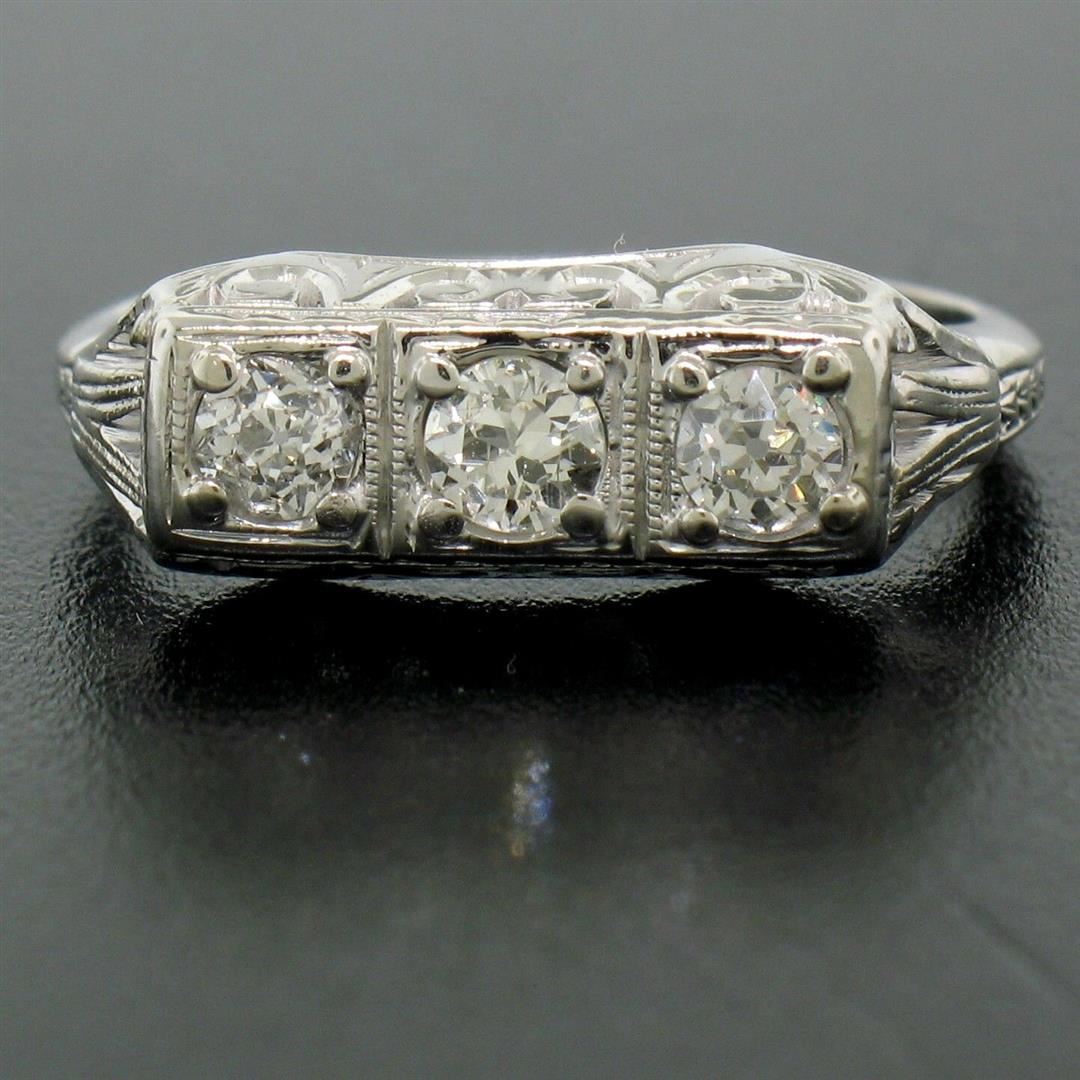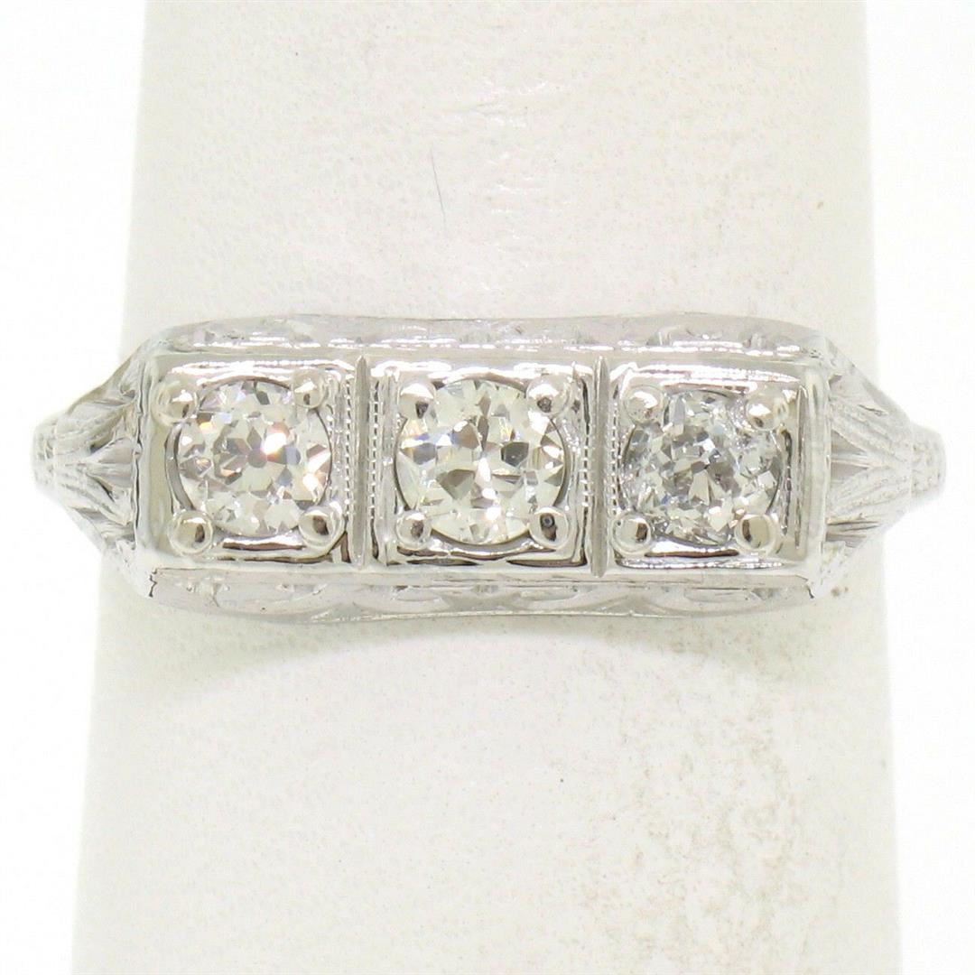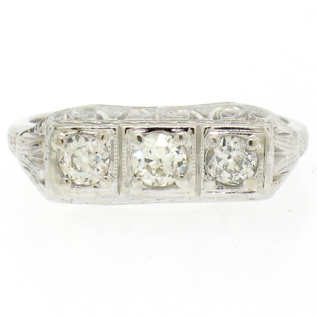 An excellent condition antique 18kt white gold ring with 0.55ctw of old European cut diamonds (H/I - VS2/SI1). The ring is size 6.5, weighs a total of 2.3 grams, and measures 6.54mm wide.