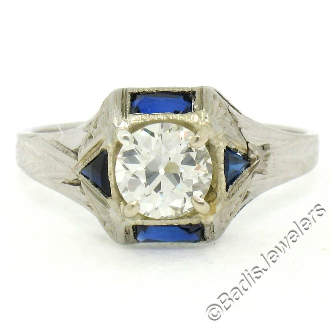 An excellent condition antique 18kt white gold ring with a 0.65ct European cut diamond (H - VS1) accented by synthetic sapphires. The ring is size 5.5, weighs a total of 2.66 grams, and the top measures approximately 9.0mm wide.